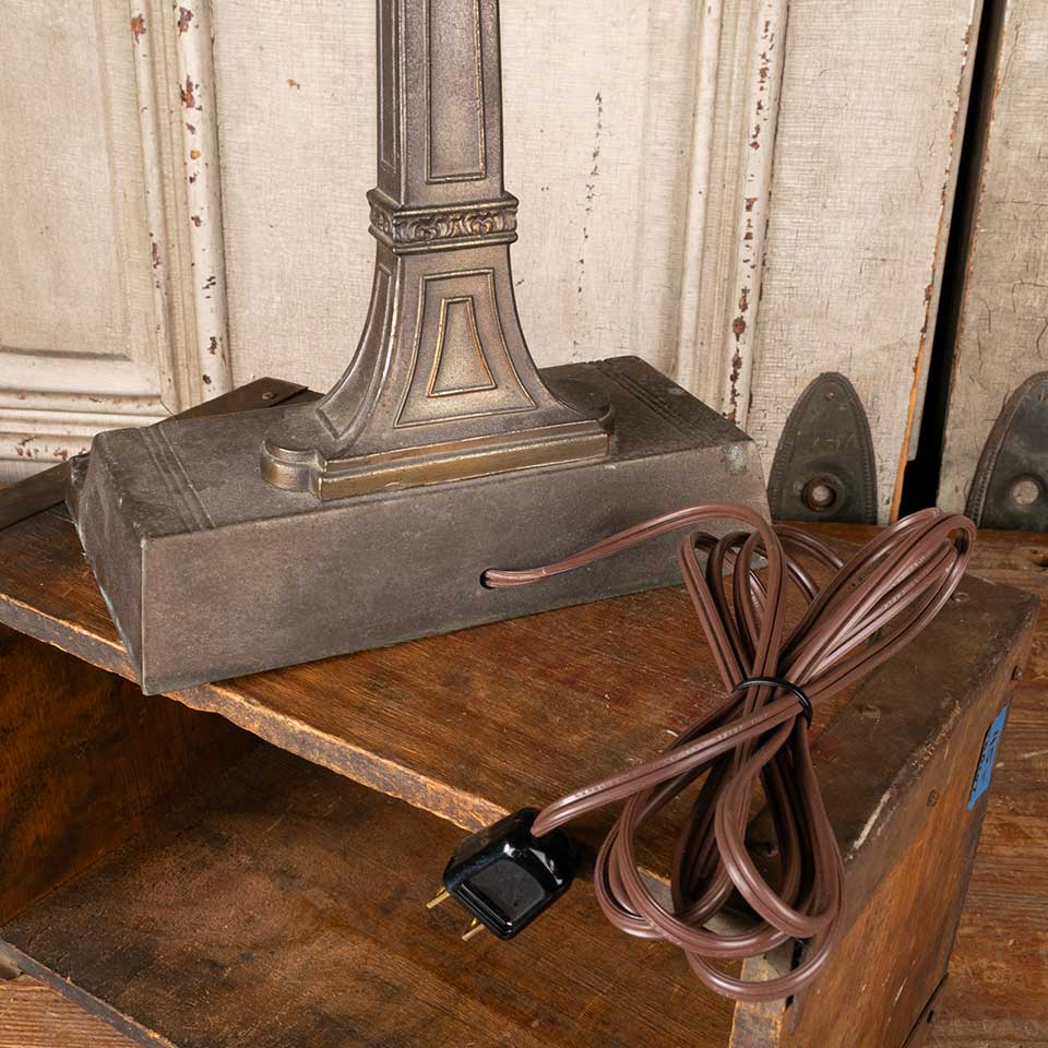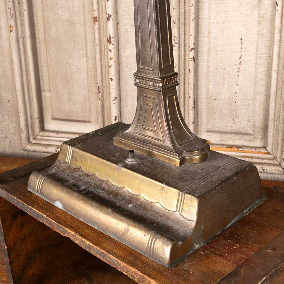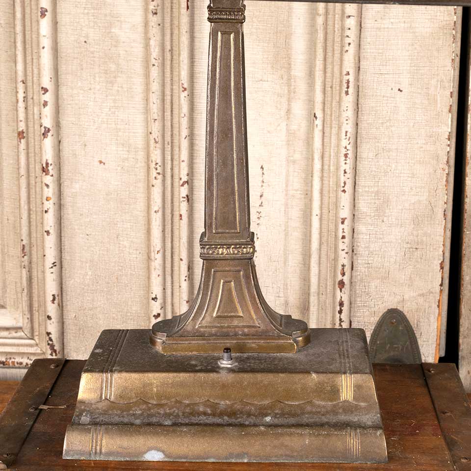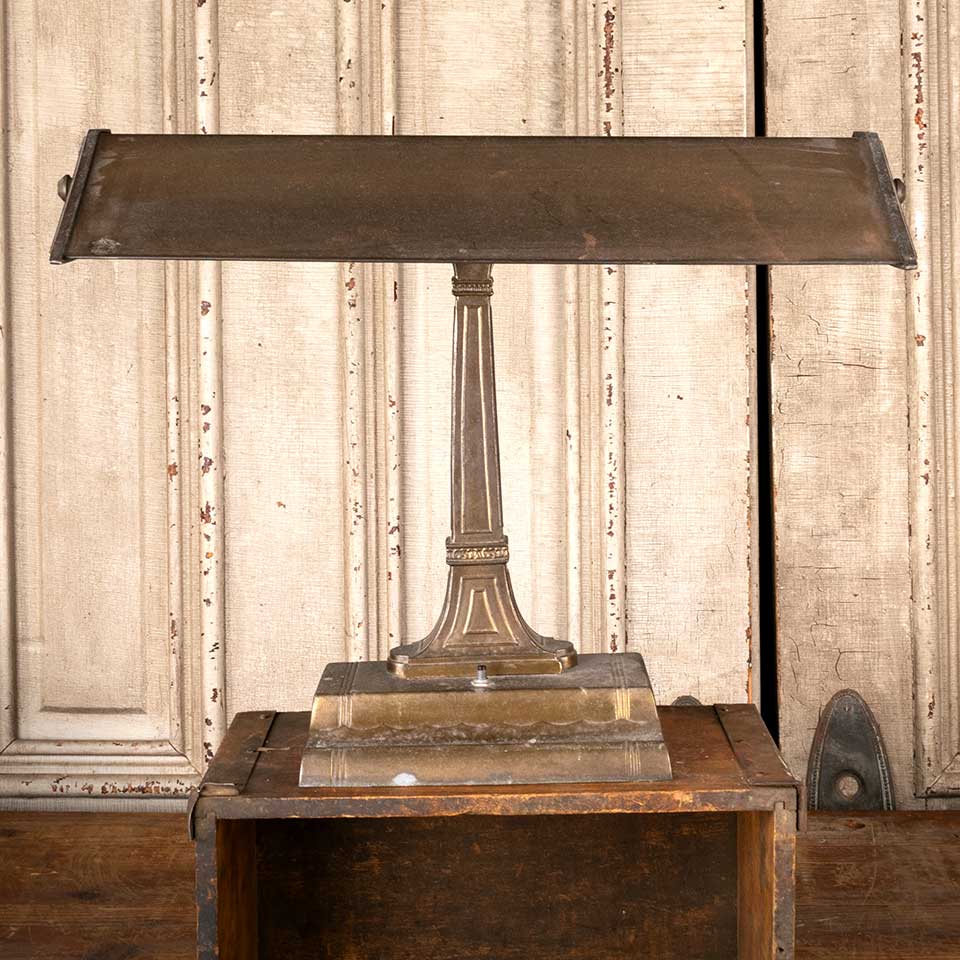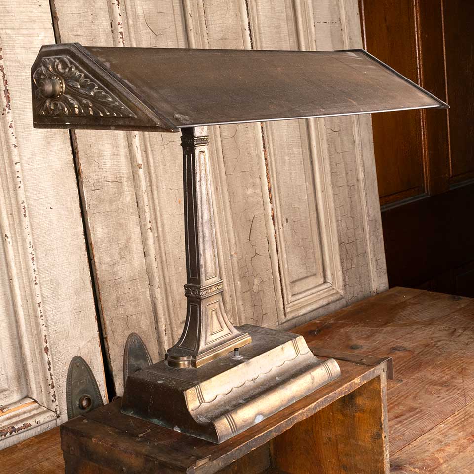 Architectural salvage antique banker's / library table / desk brass lamp measuring approx. 20 1/4" wide x 15 5/8" tall x 8 1/2" front to back. See photos to evaluate condition.