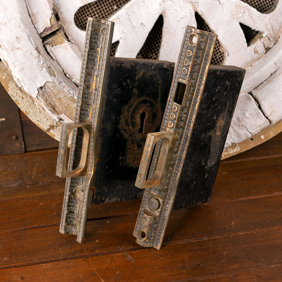 Antique architectural salvage 2 piece pocket door mortise lock set for nesting concave and convex meeting moldings. Each side measures approximately 1 1/4" x 7 5/8" face and 3 1/8" x 5 1/4" insert dimensions.