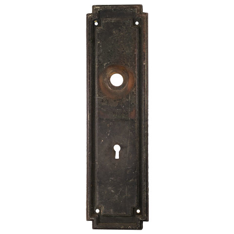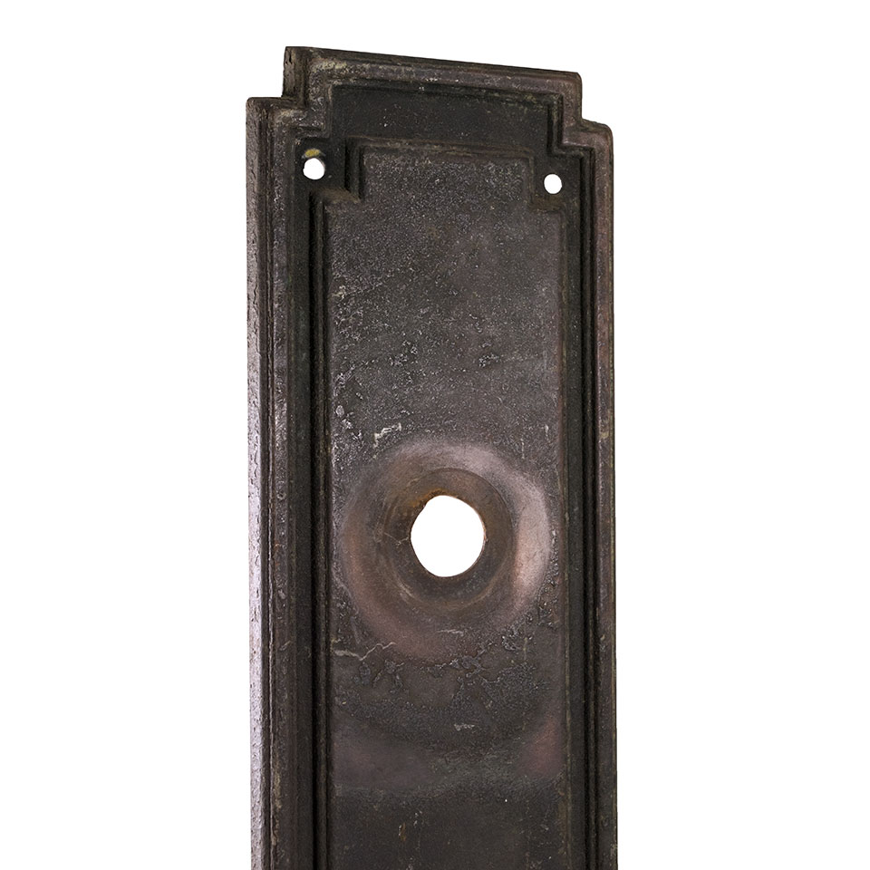 Vintage antique architectural salvage brass Arts & Crafts entry doorknob backplate measuring approximately 3" wide x 11" tall. The spindle and keyhole measure approximately 3 1/2" on center. This plate is missing the collar (See photos).