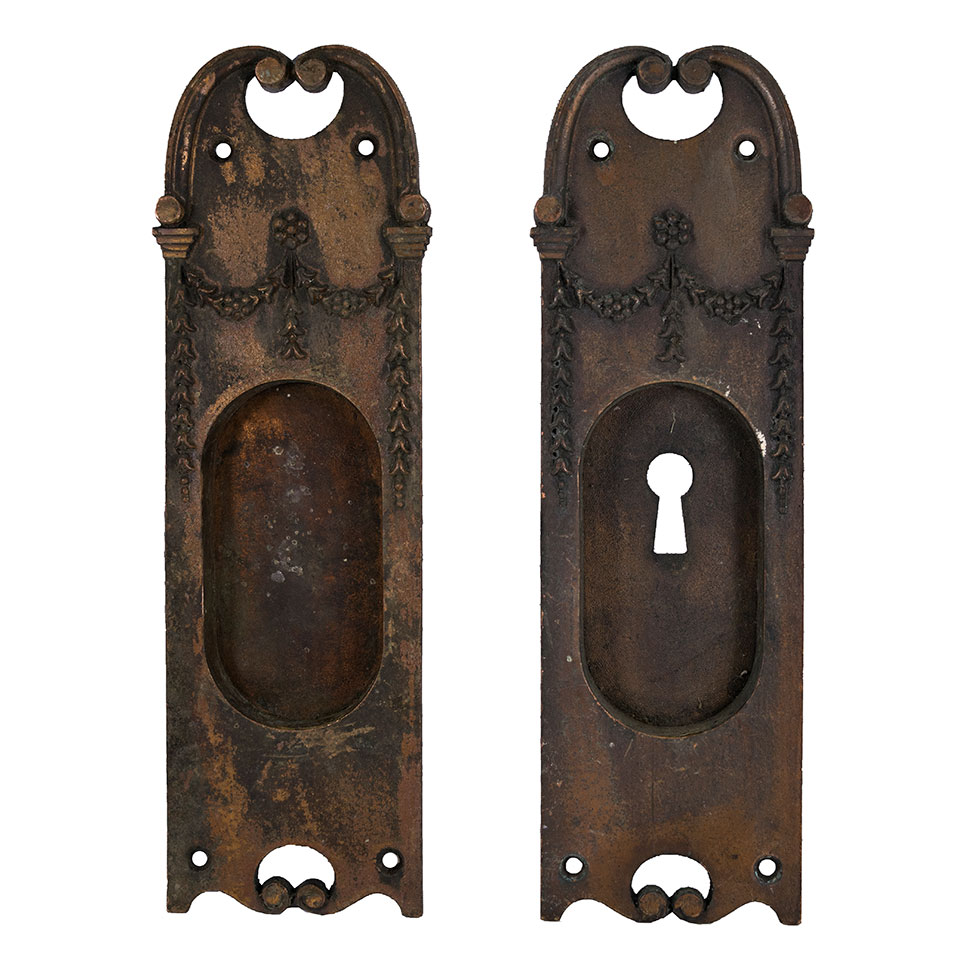 Pair of vintage/antique architectural salvage cast brass/bronze Corbin Boston pattern pocket door pulls hardware each measuring approximately 2 1/2" wide x 7 3/4" tall x 5/8" front to back. Priced at $250 per pair. Due to the nature of salvaged hardware - condition, color, and patina may vary.