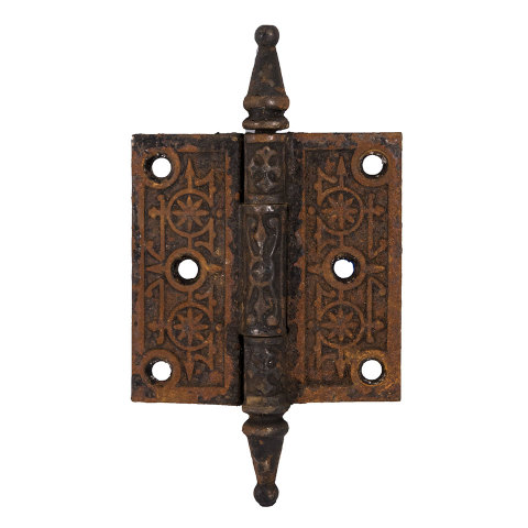 Vintage/antique architectural salvage ornate cast iron steeple finial door hinge hardware measuring approximately 3" square and 5 3/8" tall including finials.