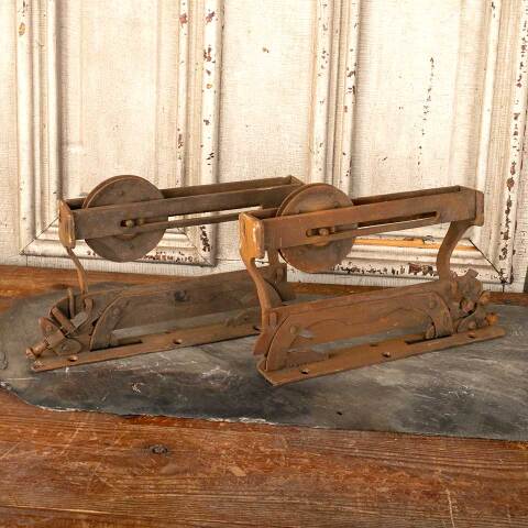 Architectural salvage antique functional pocket door roller hanger hardware pair each measuring approx. 2" wide x 7 3/8" tall x 11 1/4" front to back with a 3 1/4" diameter trolley wheel. Color and condition vary, see photos to evaluate. Priced at $150/pair.