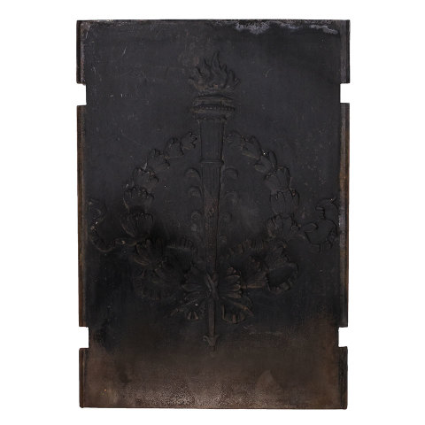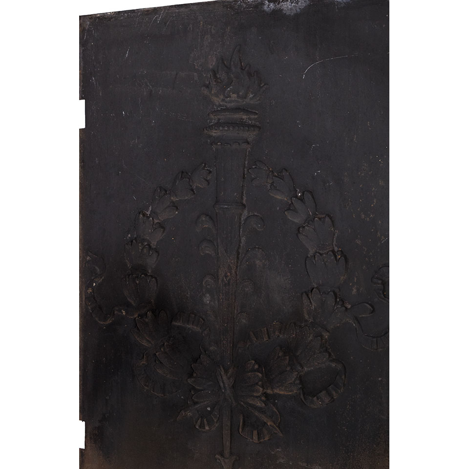 Antique architectural salvage cast iron fireplace fireback panel with torch and laurel wreath measuring approx. 20 3/4" wide x 30" tall x 1/2" front to back. See photos to evaluate condition.