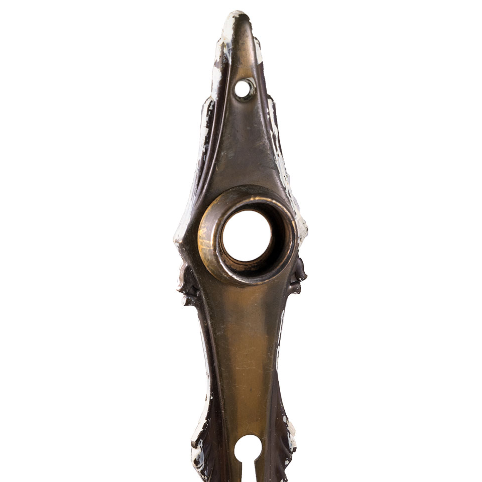 Vintage/antique architectural salvage pressed metal elongated Art Deco doorknob backplate measuring approximately 1 1/2" wide x 8 3/8" tall with a 3/8" collar. The spindle and keyhole measure 2 1/2" on center. Priced at $20/each. Due to the nature of salvage hardware - condition, color, and patina may vary.
