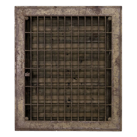 Vintage/antique architectural salvage pressed metal heat grate with operable louvers measuring approximately 10" x 12" (insert dimensions) and 11 7/8" x 13 7/8" (overall dimensions).
