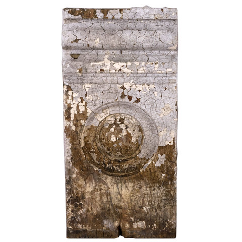Vintage/antique architectural salvage wood rosette trim block measuring approximately 6 3/8" wide x 13 1/4" tall x 1 1/2" thick. Due to the nature of architectural salvage - condition and color may vary.