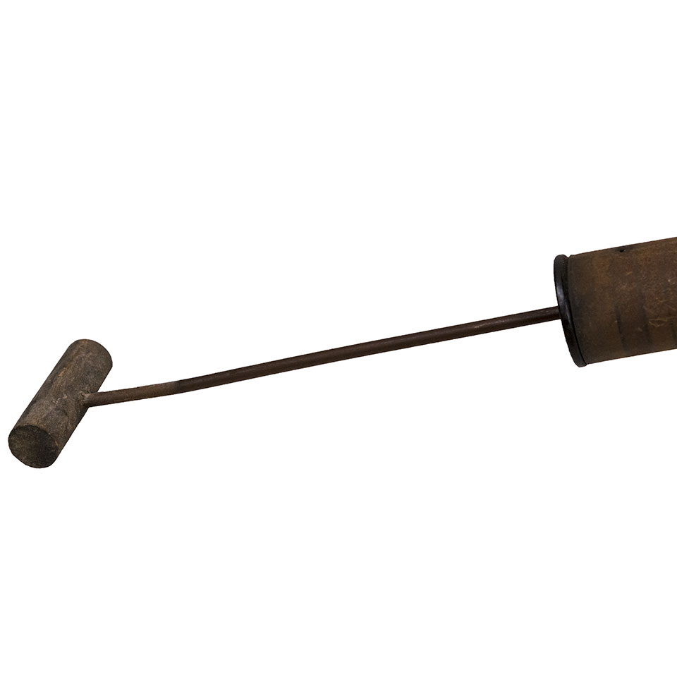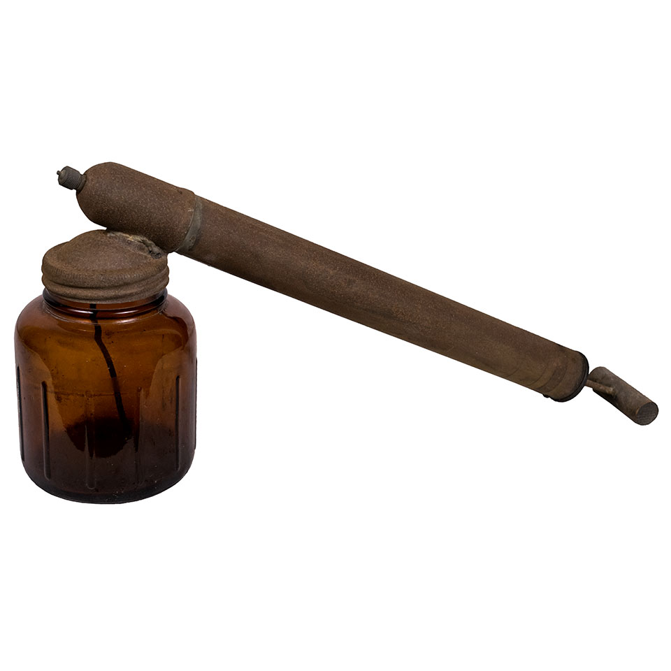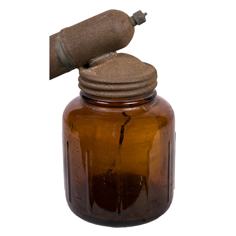 Vintage/antique metal bug sprayer with amber/brown glass jar measuring approximately 4" wide x 7 3/4" tall x 16" long.