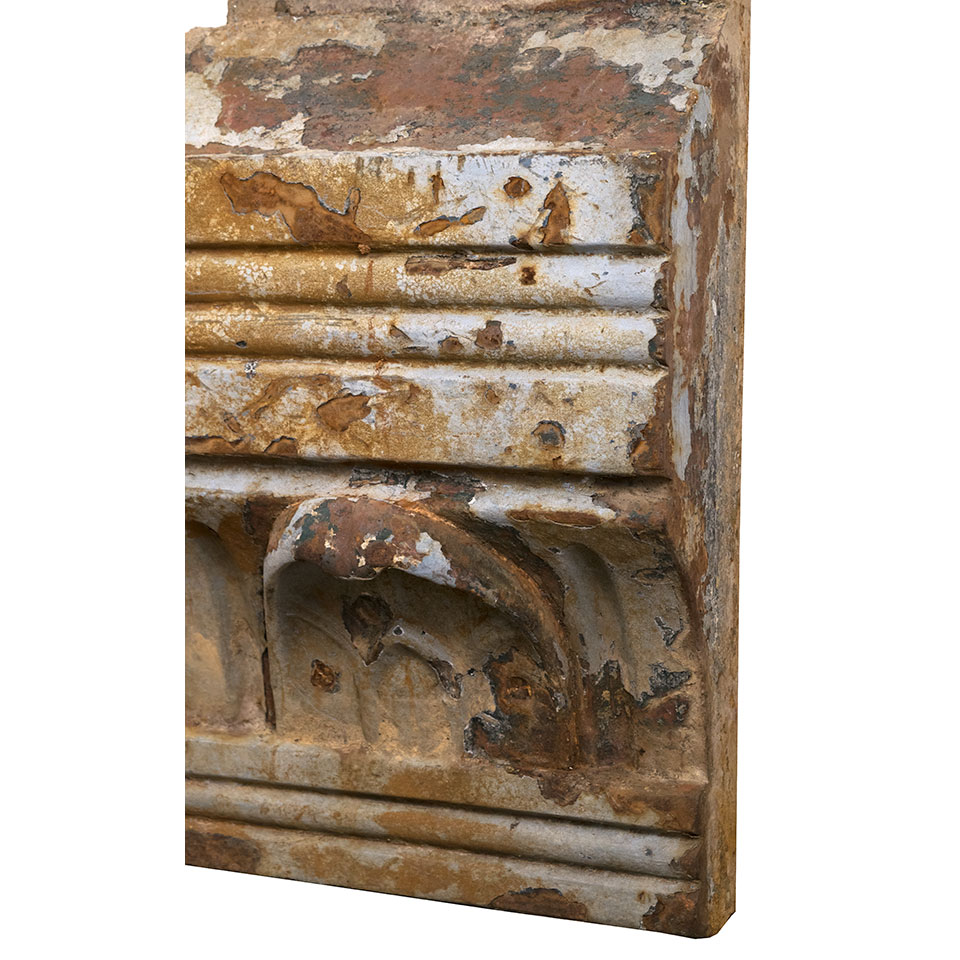 Vintage/antique architectural salvage decorative cast iron building facade remnant measuring approximately 13" wide x 20" tall x 7 1/2" front to back.