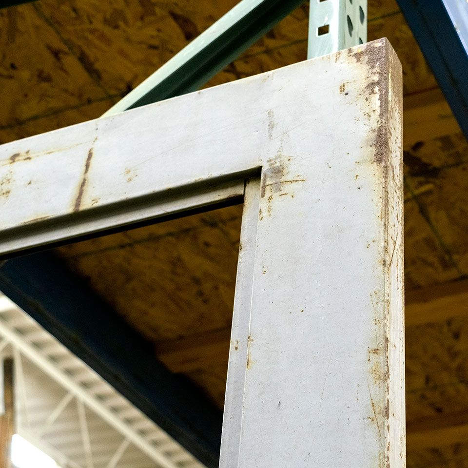 Architectural salvage large industrial metal half lite door measuring approximately 47 1/2" wide x 95 1/4" tall x 1 3/4" thick. There is no glass currently in the door.