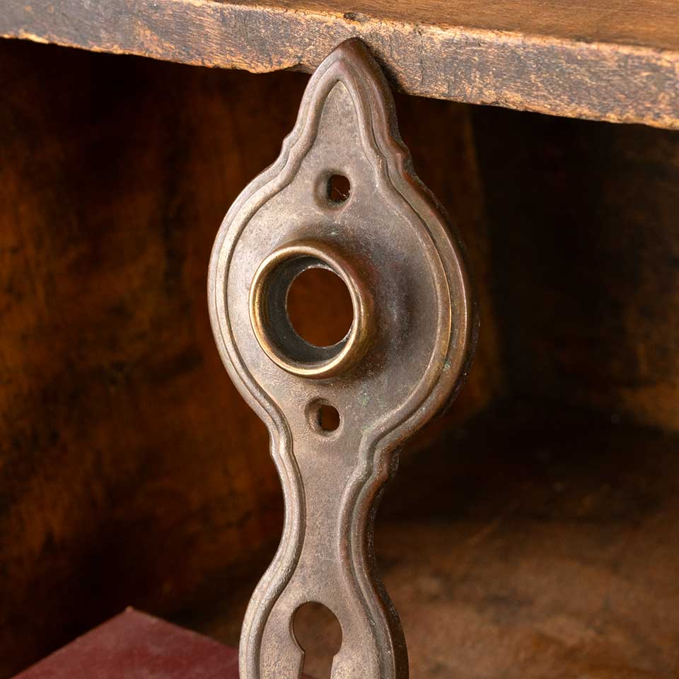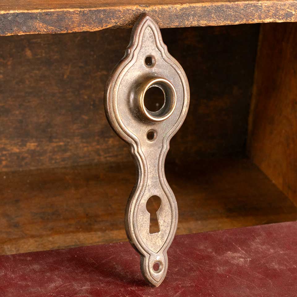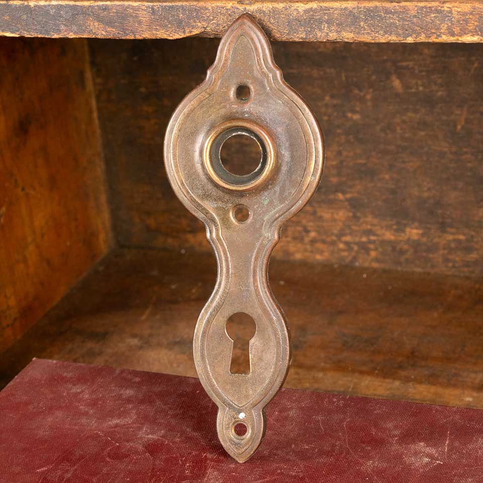 Architectural salvage antique stamped / pressed brass Art Deco doorknob backplate door hardware with keyhole measuring approx. 2" wide x 5 5/8" tall with a 3/4" diameter collar. Spindle and keyholes measure 2 1/2" on center. See photos to evaluate condition.