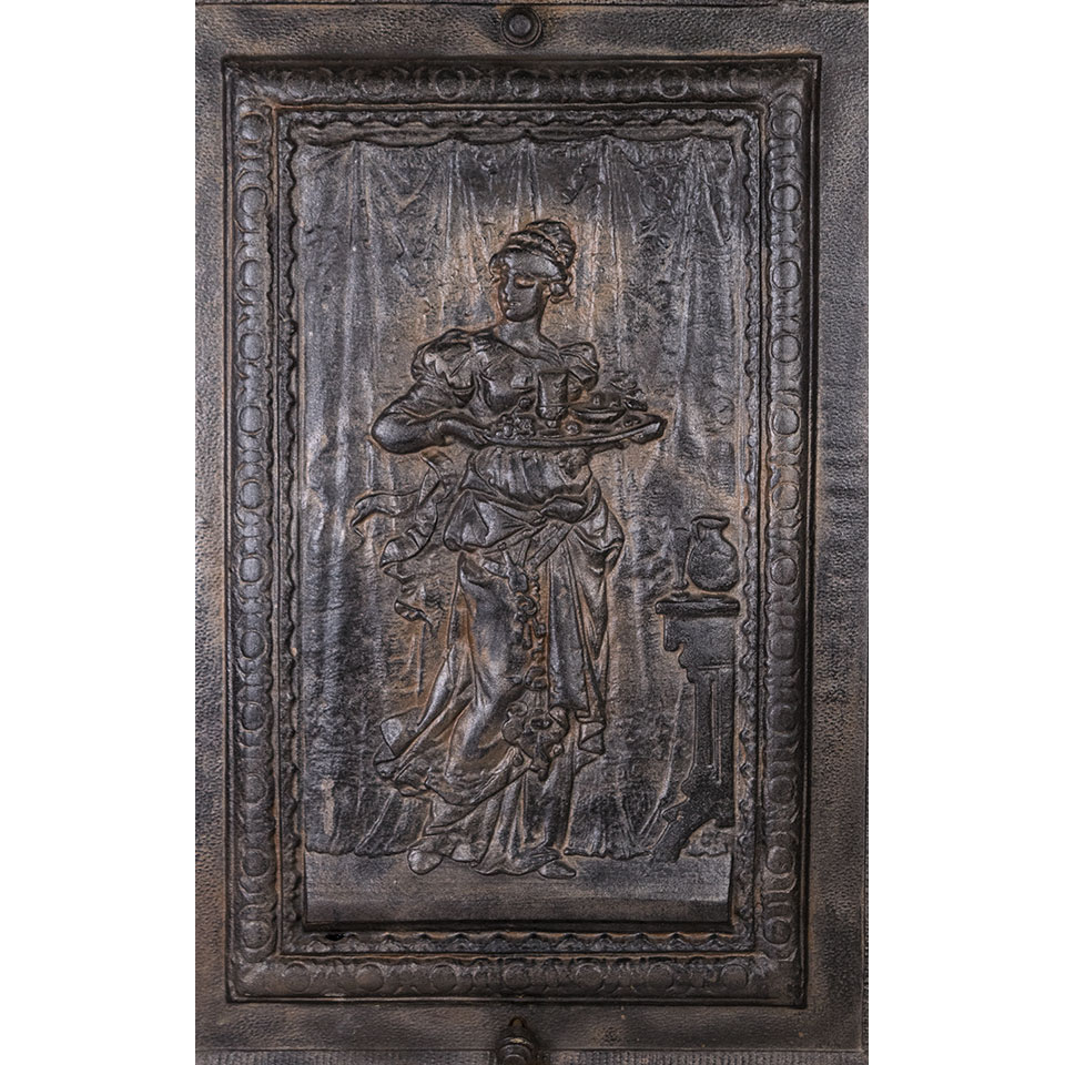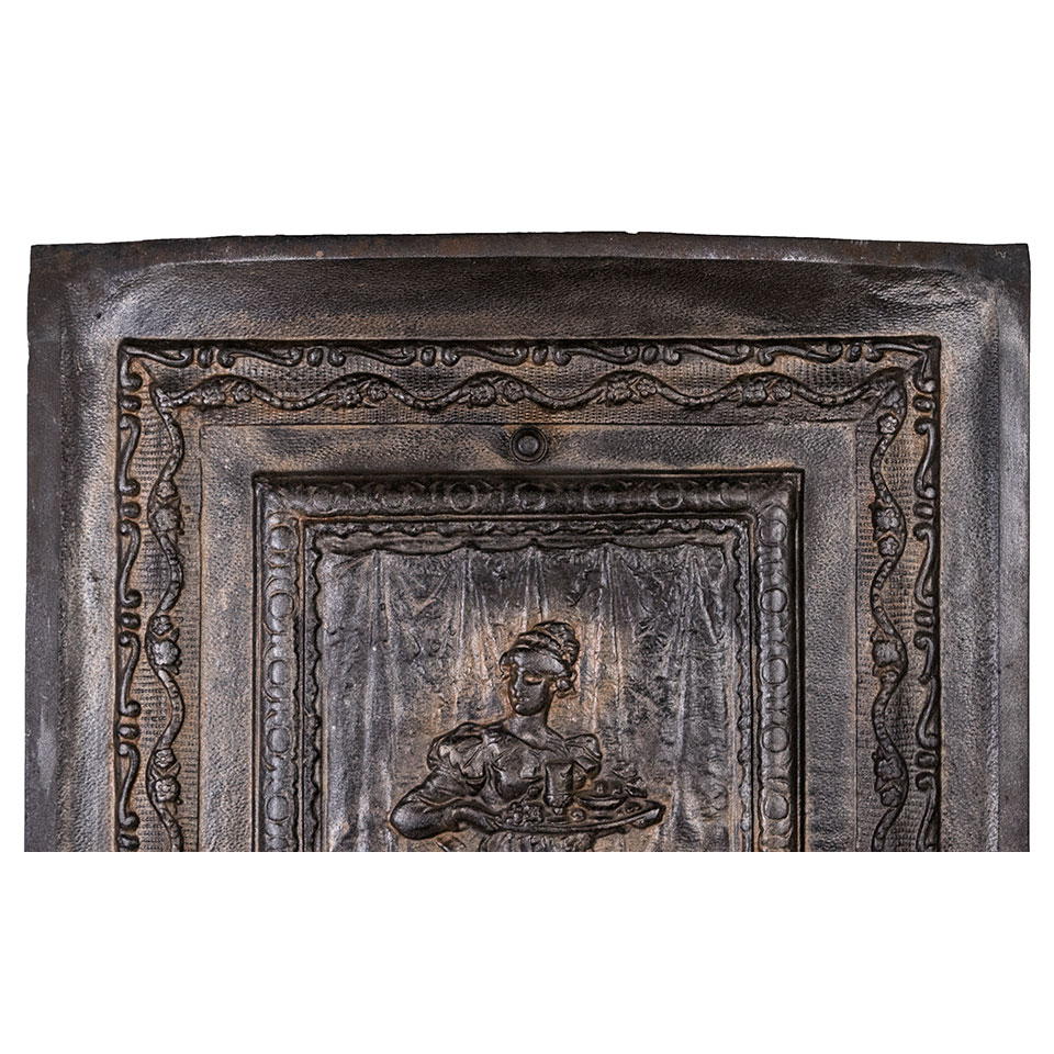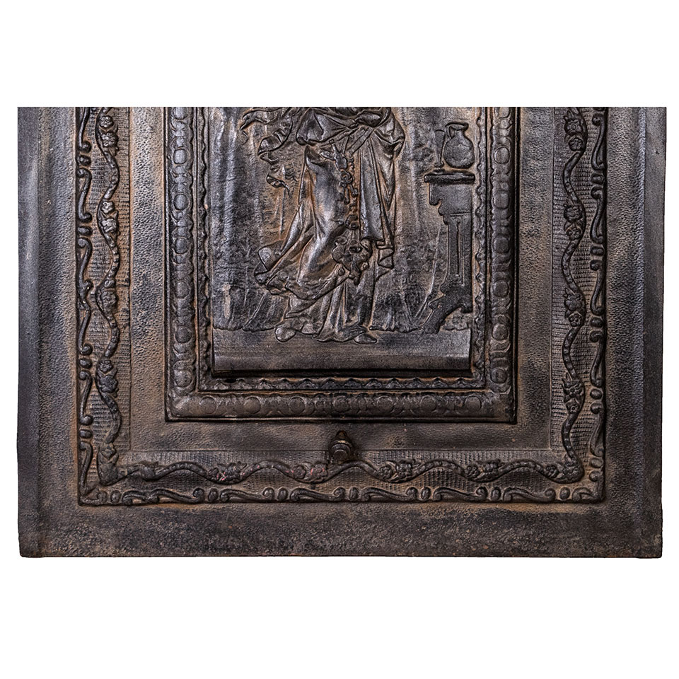 Architectural salvage antique cast iron fireplace summer front cover with figural motif measuring approx. 20 1/4" wide x 26 3/4" tall x 2" front to back. See photos to evaluate condition.