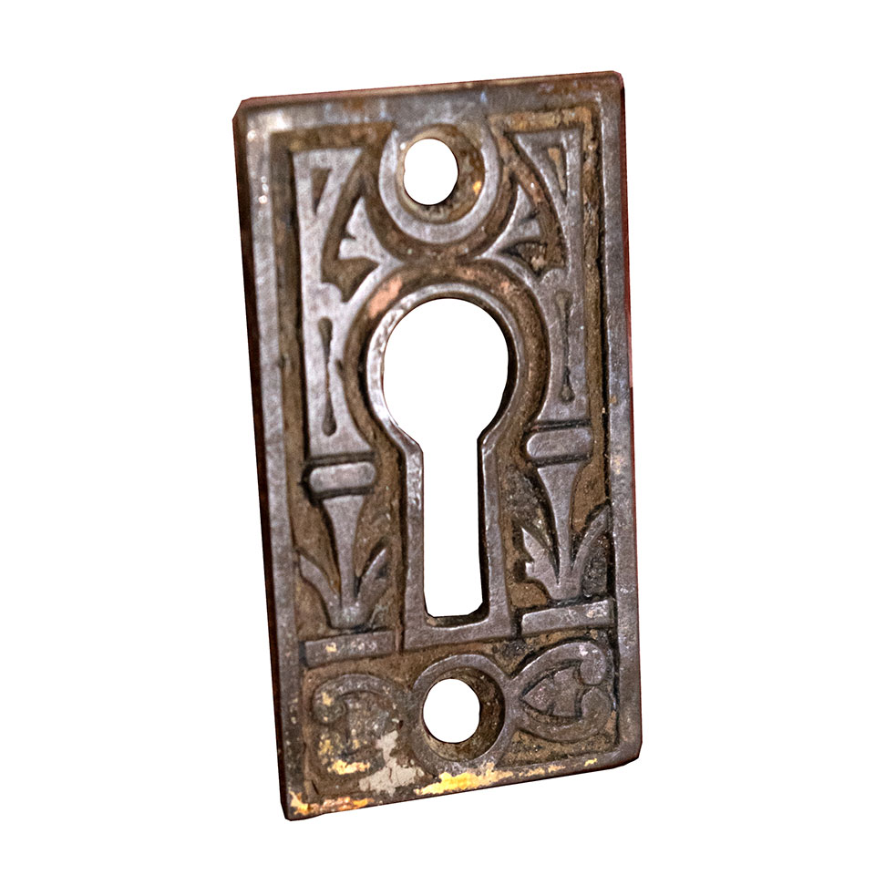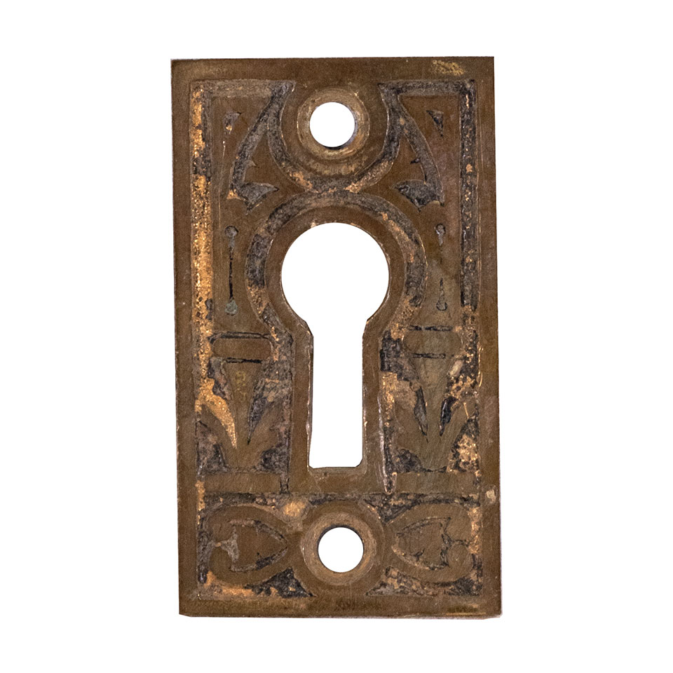 Vintage antique architectural salvage ornate cast brass keyhole escutcheon cover plate door hardware measuring approximately 1" wide x 1 7/8" tall. Mounting holes measure 1 1/4" on center. Priced at $20/each. Due to the nature of salvaged hardware - condition, color, and patina may vary.