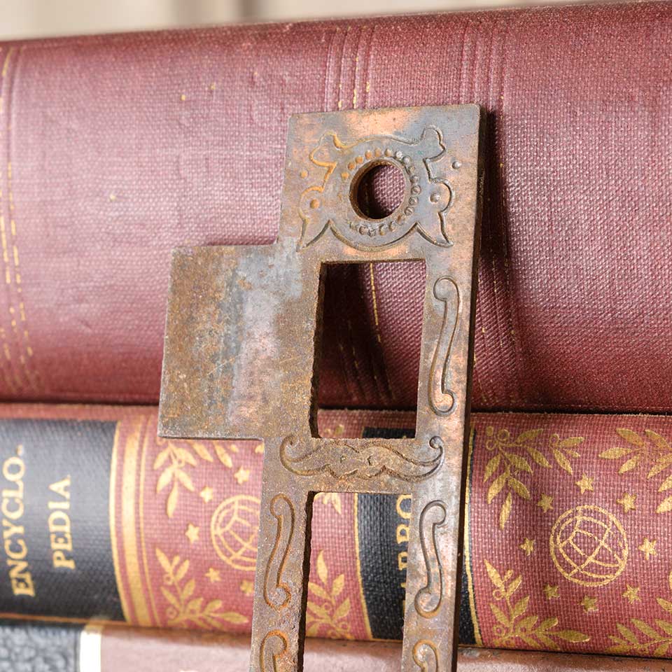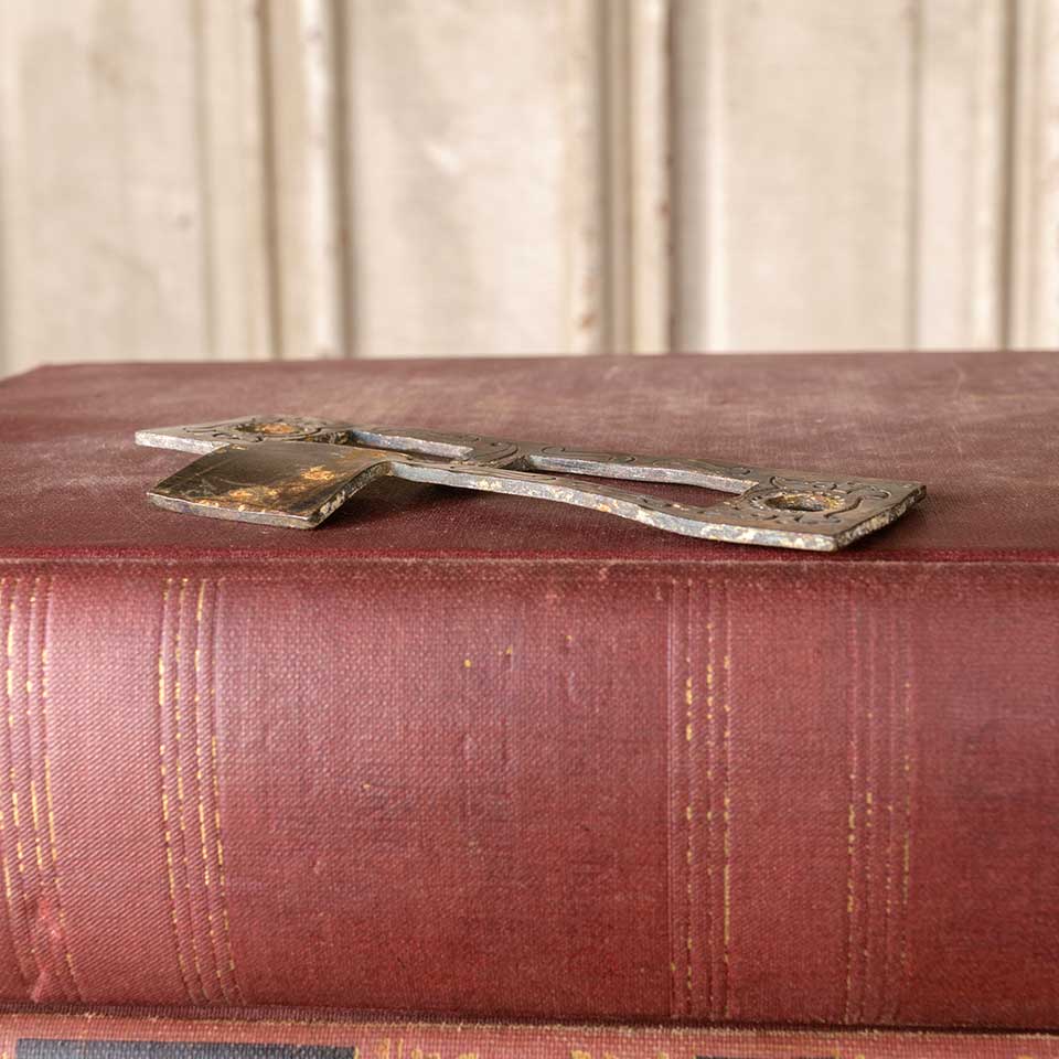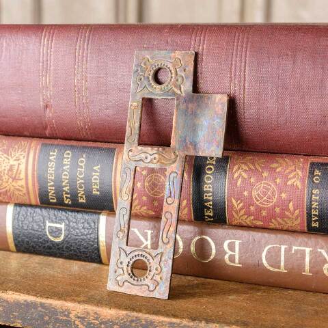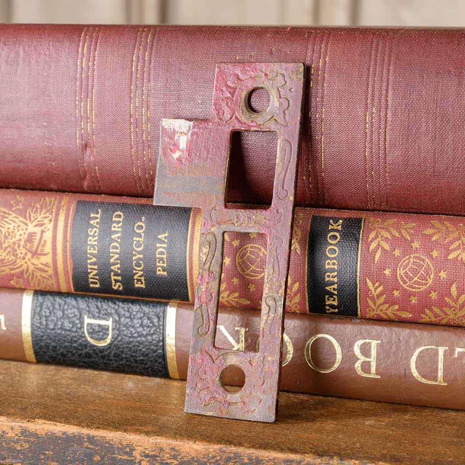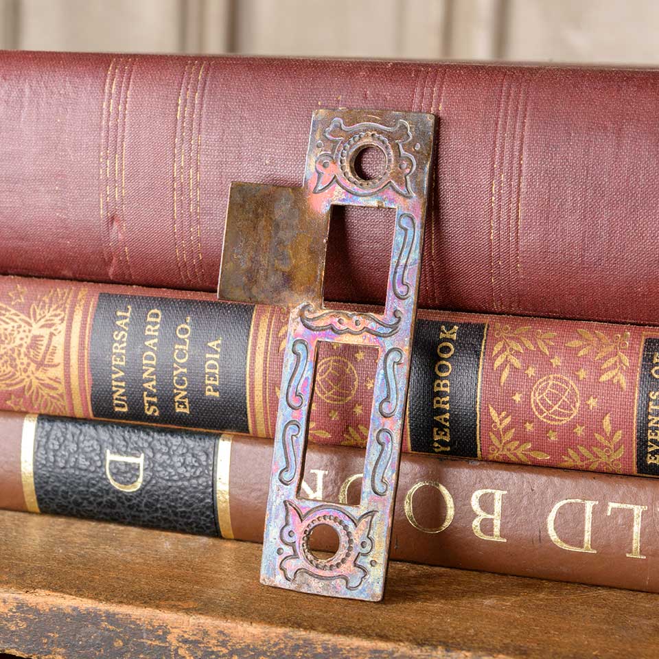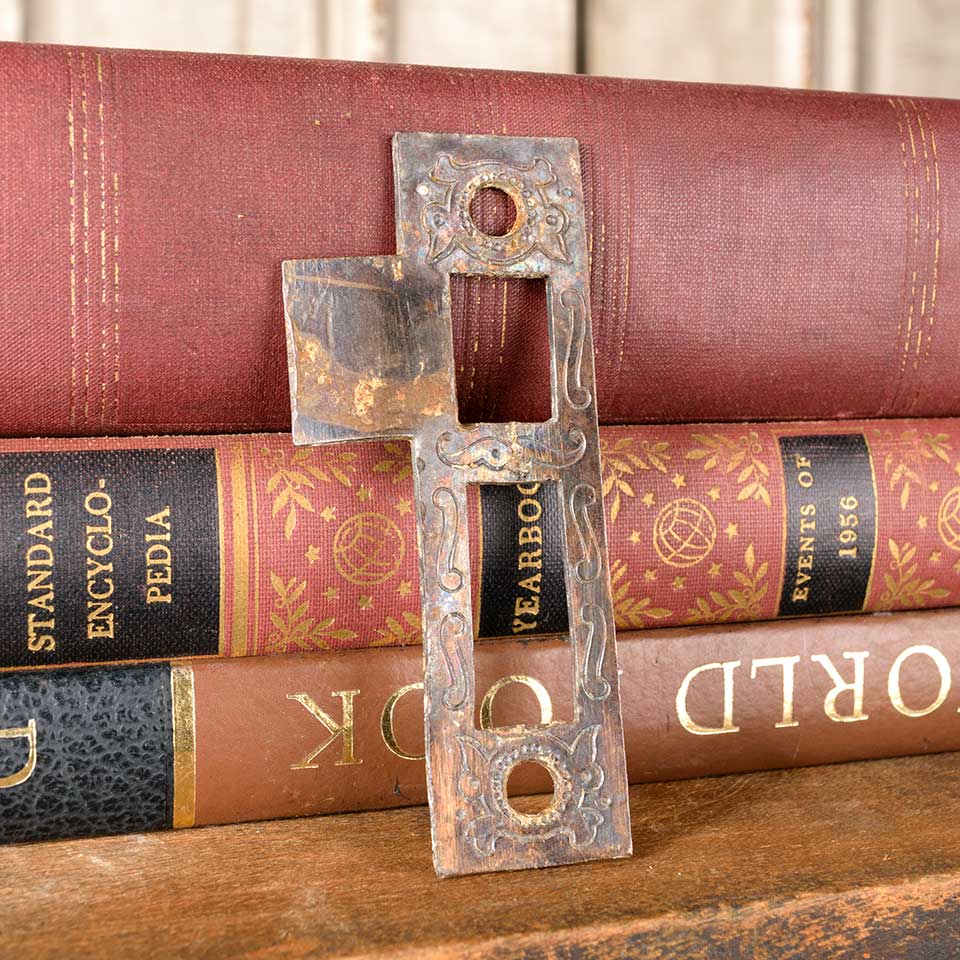 Architectural salvage antique Russell & Erwin Villa pattern (circa 1890) steel strike plate door hardware measuring approx. 1" wide x 2 1/2" tall x 1/16" thick with a tongue projection of 1/2". The distance between latch and deadbolt cutouts measures 1/4". Latch cutout measures 5/8" wide x 3/4" tall and deadbolt cutout measures 5/8" wide x 1 1/4" tall. Screw holes measure 2 3/4" on centers. Color and condition vary.
