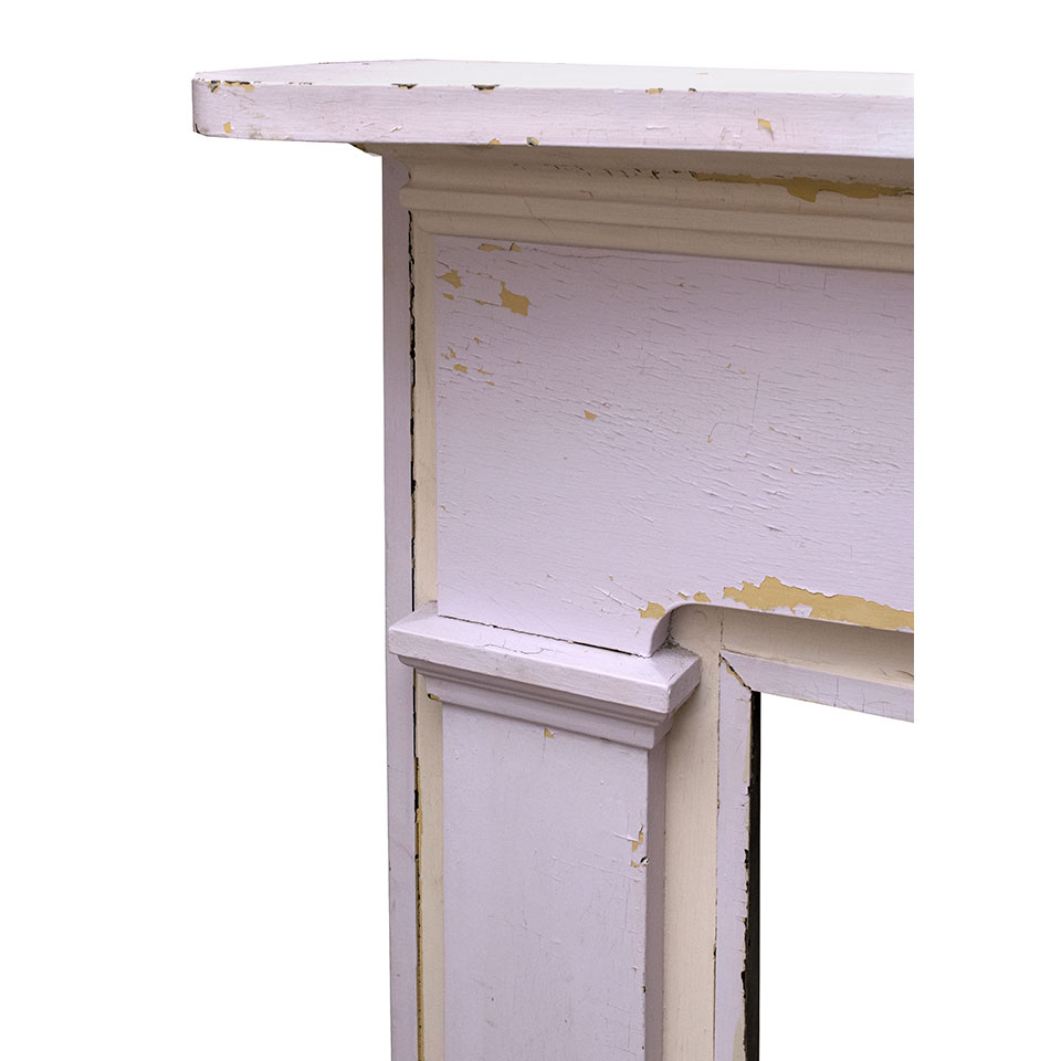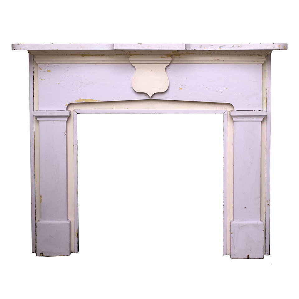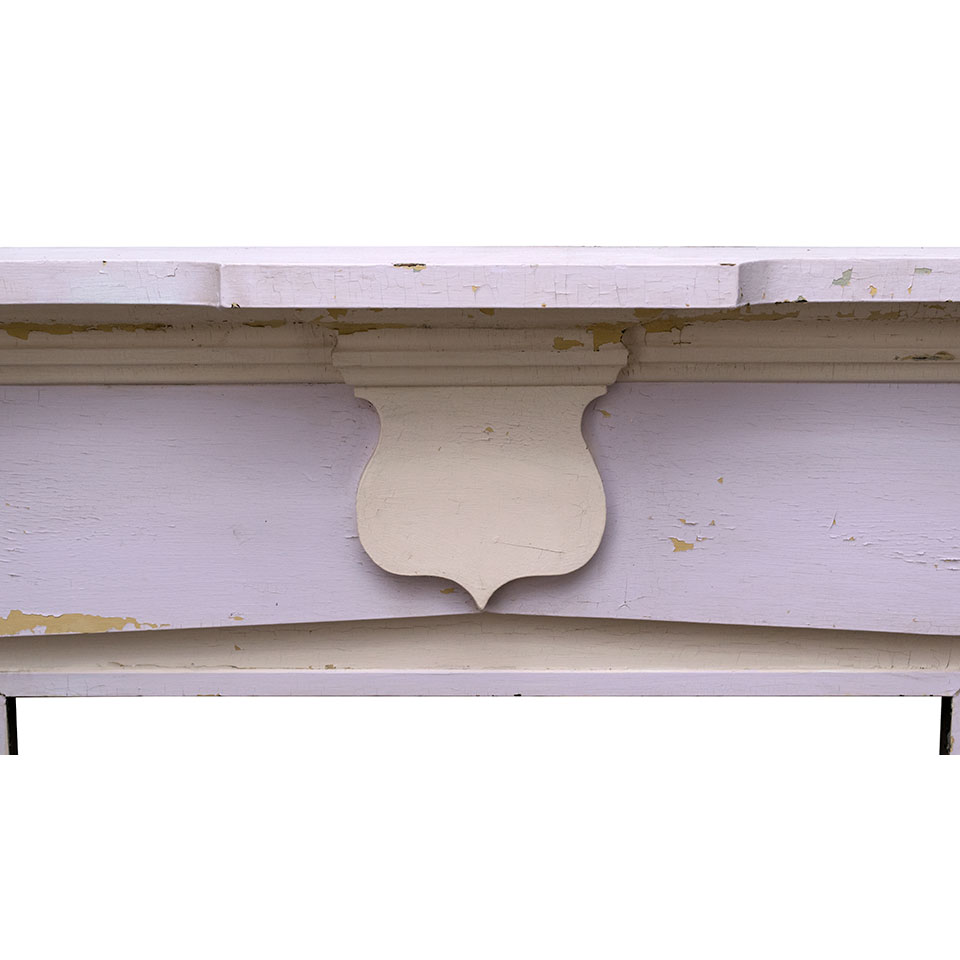Vintage antique architectural salvage painted wood fireplace mantel / mantle with cartouche and curved mantel shelf measuring approximately 59 1/2" wide x 47 3/4" tall x 9 1/4" front to back. The interior firebox opening measures approximately 33 1/4" wide x 32" tall. See photos to evaluate condition.