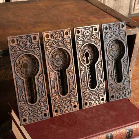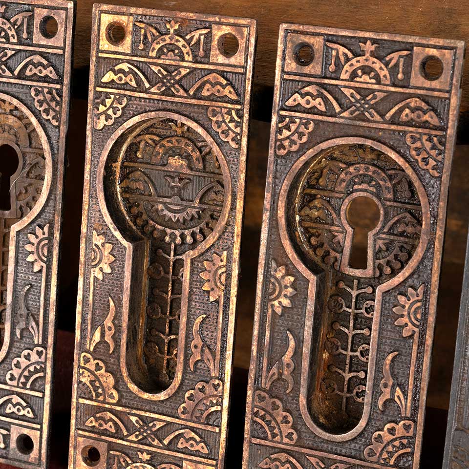 Set of four architectural salvage antique cast iron Victorian pocket door hardware pulls with Eastlake designs each measuring approx. 2 1/8" wide x 5 3/4" tall with a recessed area 1 5/8" wide x 3 3/8" tall (2 plates with keyholes & 2 without). See photos to evaluate condition. Priced at $350 for the set.