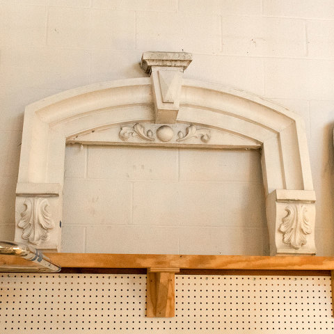 Vintage antique architectural salvage hollow zinc metal window pediment with keystone measuring approximately 47 1/2" wide x 37" tall with a 9" projection. Interior window opening measures approximately 34" wide x 21" tall. More available. Please CONTACT US for details.