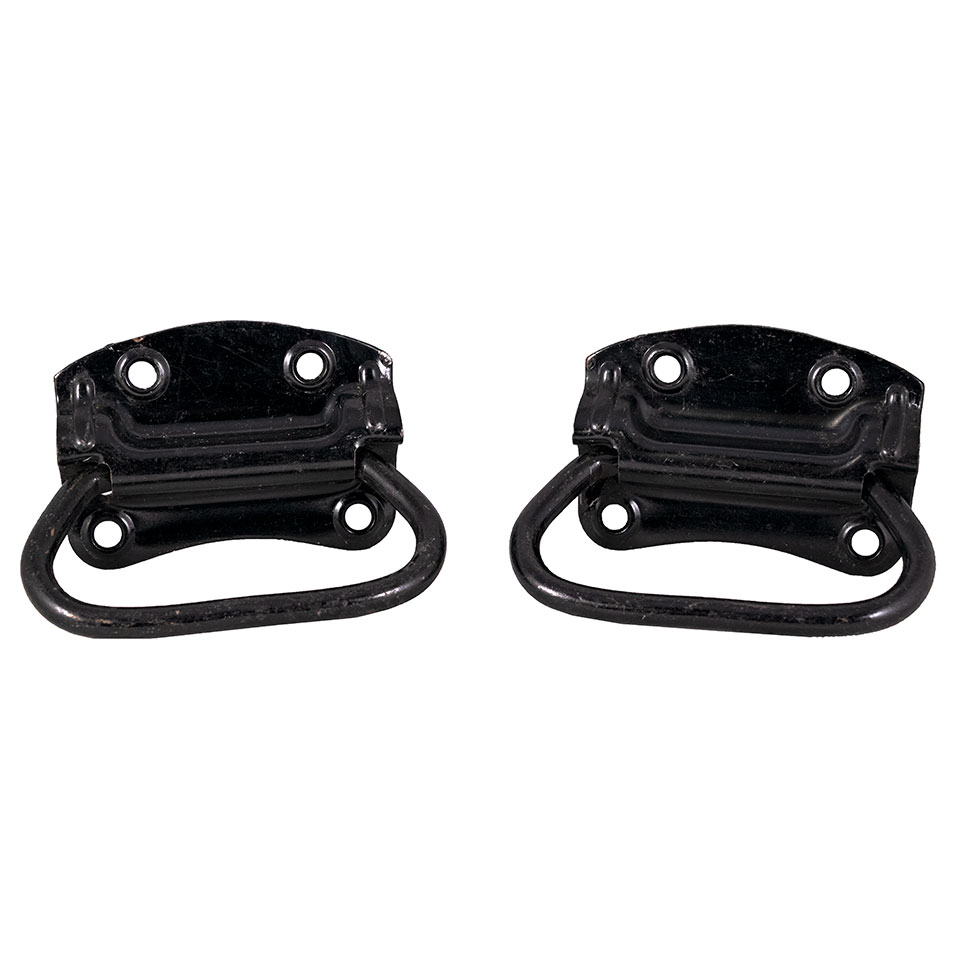 Pair of vintage Stanley steel heavy duty industrial trunk, toolbox, ammo box bail handles each measuring approximately 4 7/8" wide x 4 1/4" tall (overall). The mounting bracket alone measures 4 1/8" wide x 3" tall with screw holes measuring 2" on center (top of bracket) and 3" on center (bottom of bracket). Priced at $30/per pair.