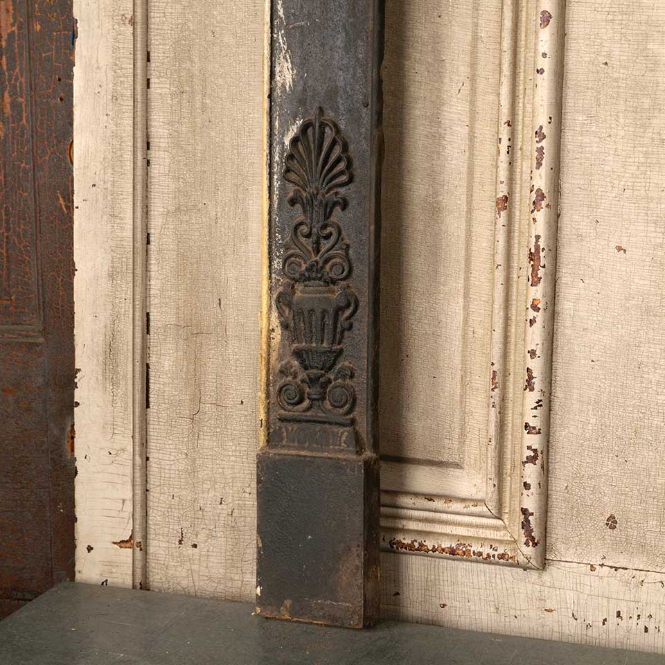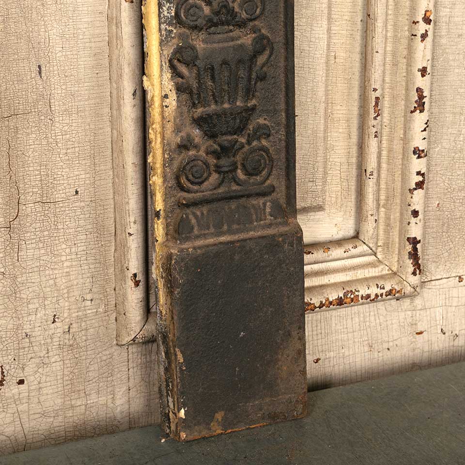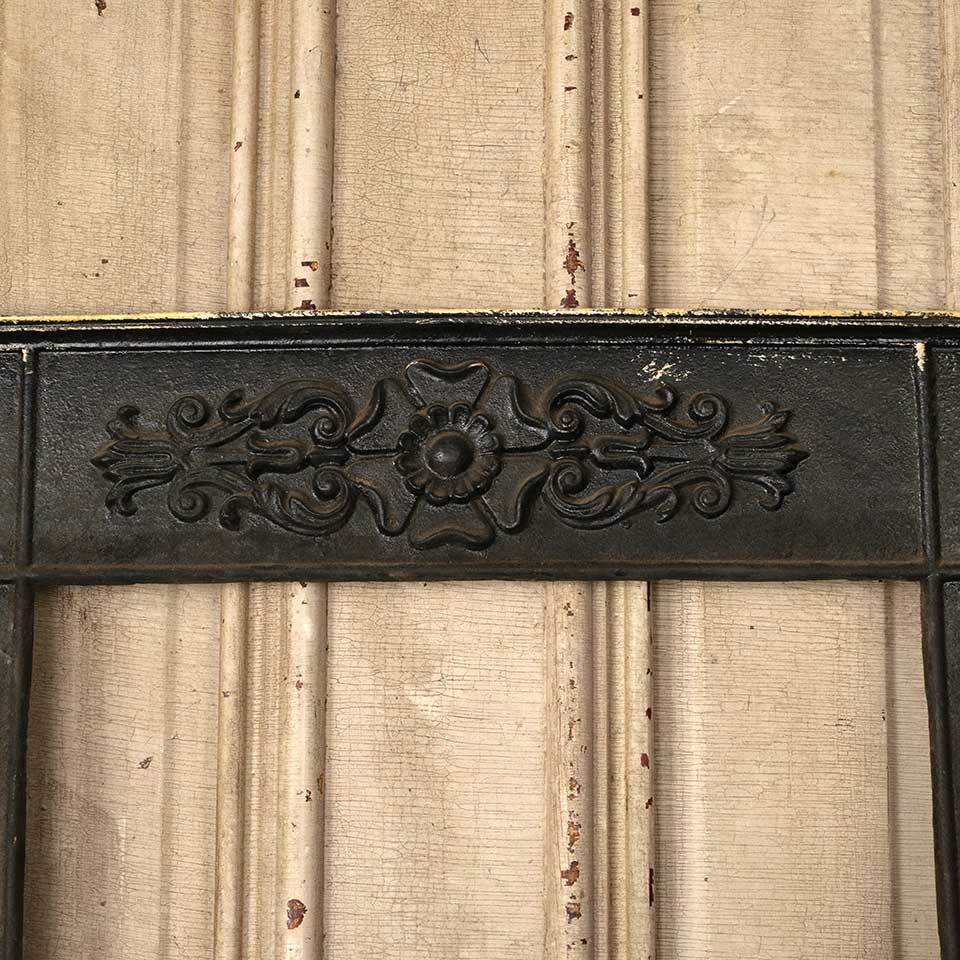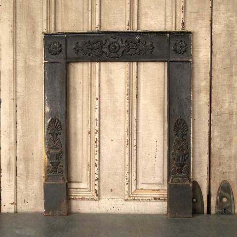 Architectural salvage ornate antique cast iron fireplace surround measuring approx. 24 7/8" wide x 30 1/2" tall x 7/8" front to back. The interior firebox opening measures approx. 16 5/8" wide x 25 1/2" tall. See photos to evaluate condition.