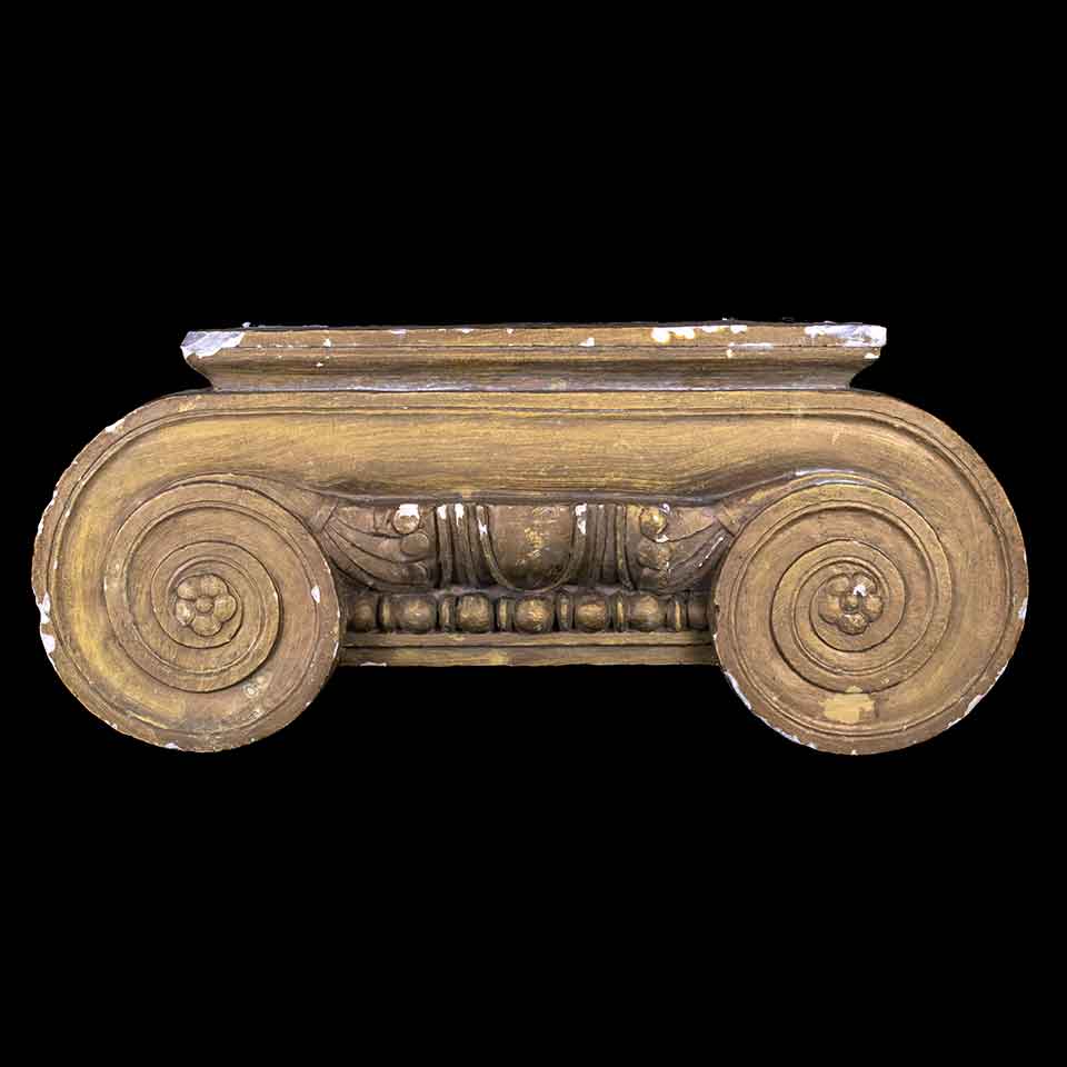 Vintage antique architectural salvage ornamental cast plater ionic column capital facade measuring approximately 28 1/2" wide x 12 1/4" tall x 4" front to back.