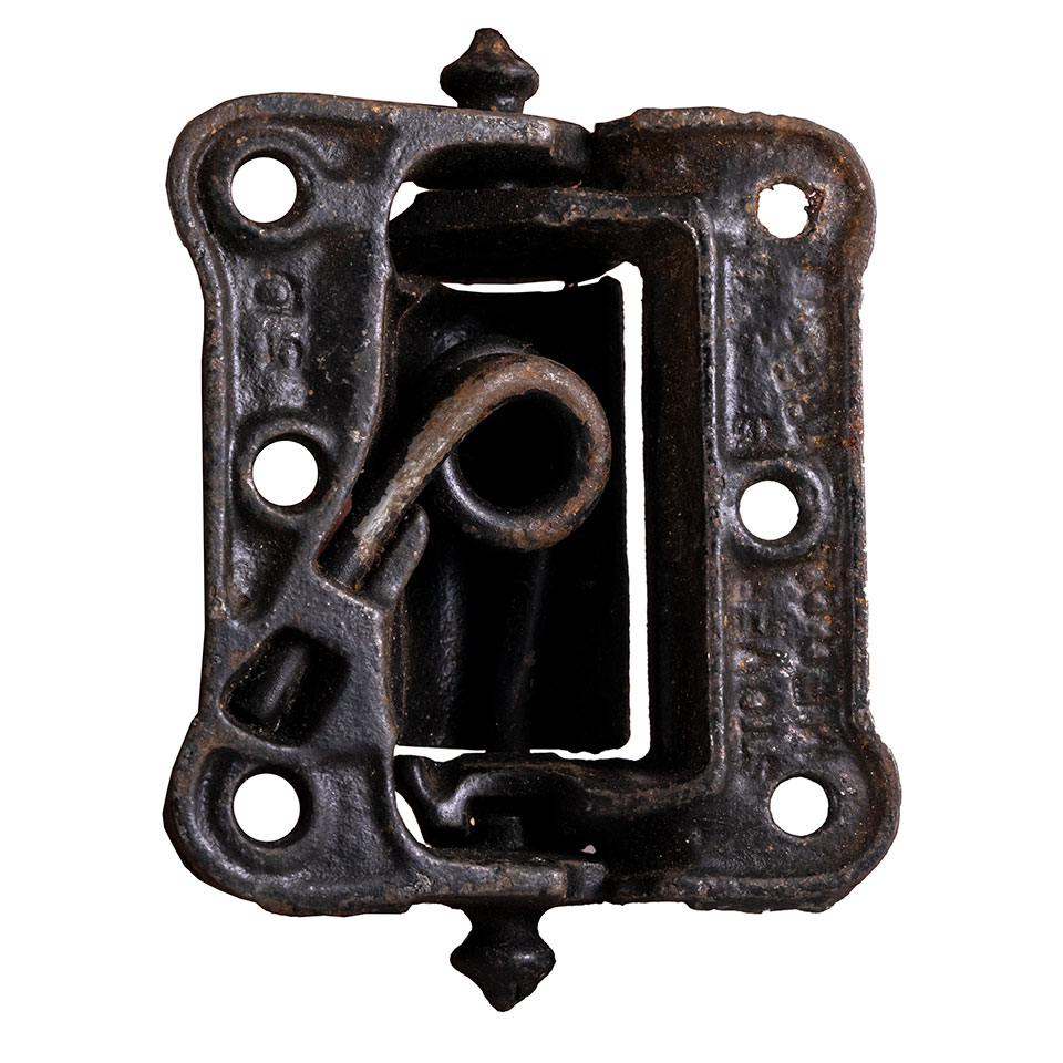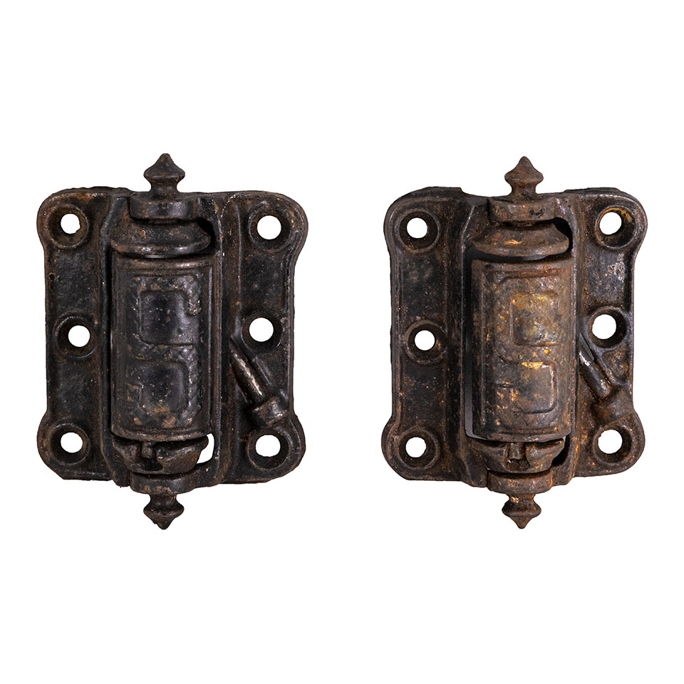 Pair of vintage antique architectural salvage cast iron spring loaded screen door hinges made by Stover Mfg Co of Freeport, IL. Each hinge measures approximately 2 5/8" wide x 3 5/8" tall x 1 1/8" front to back. Priced at $75 for the pair.