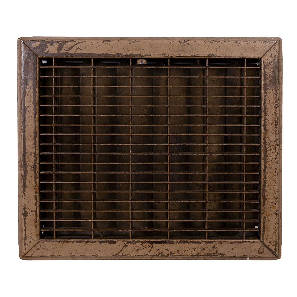 Vintage antique architectural salvage pressed metal heat grate with operable louvers measuring approximately 10" x 12" (insert dimensions) and 11 5/8" x 13 7/8" (overall dimensions).