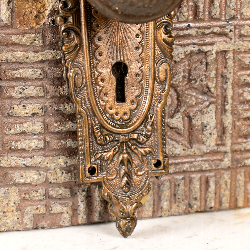 Antique architectural salvage Russell & Erwin Arabian pattern interior door hardware set circa 1897 including a pair of wrought steel 2 1/4" diam knobs with spindle and tapped set screws and a pair of approximately 2 1/2" wide x 8 3/4" tall cast iron backplates with brass collars. Sold in sets. Priced at $175 per set. Condition and patina may vary.