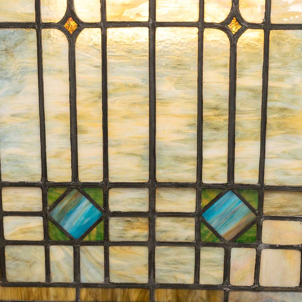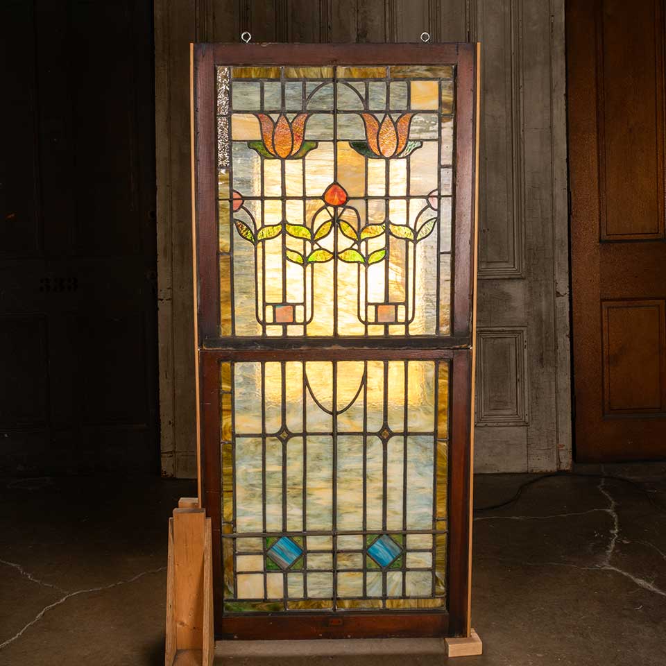 Architectural salvage antique stained glass window sashes with floral motif together measuring approx. 30 1/4" wide x 67 1/4" tall x 1 3/8" thick. There are some cracked panes, but no missing glass. See photos to evaluate condition.