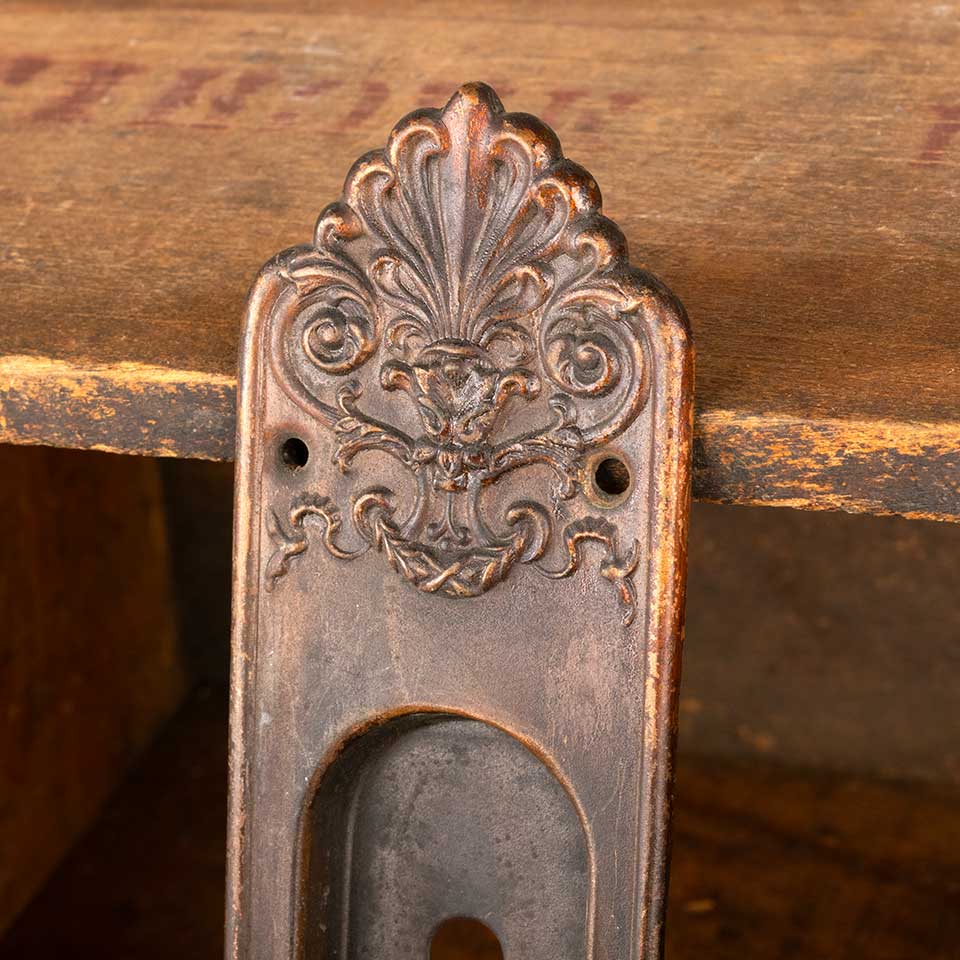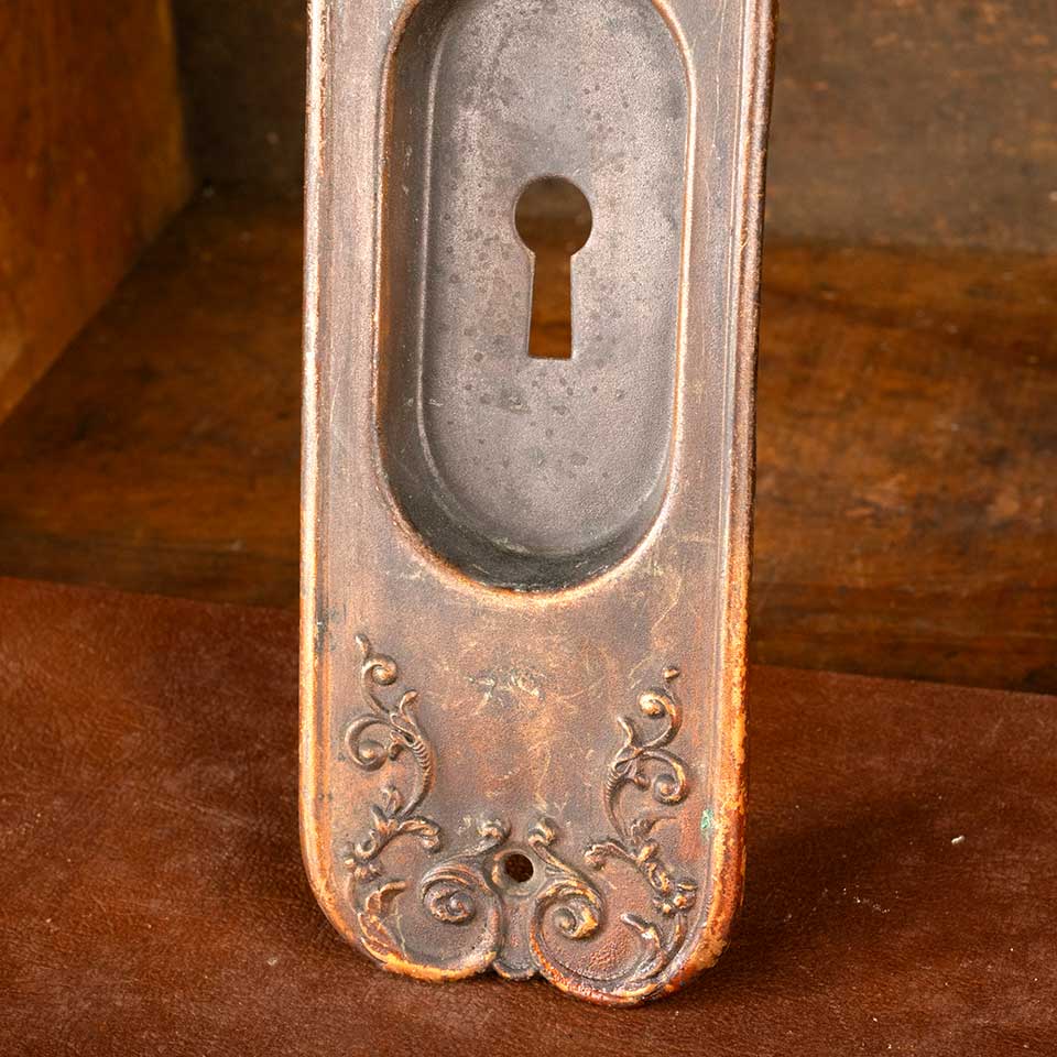 Architectural salvage single antique ornate brass pocket door hardware pull handle hardware with keyhole measuring approx. 2 1/4" wide x 8 1/4" tall with the recessed area measuring 1 1/2" wide x 3 1/8" tall. See photos to evaluate condition.