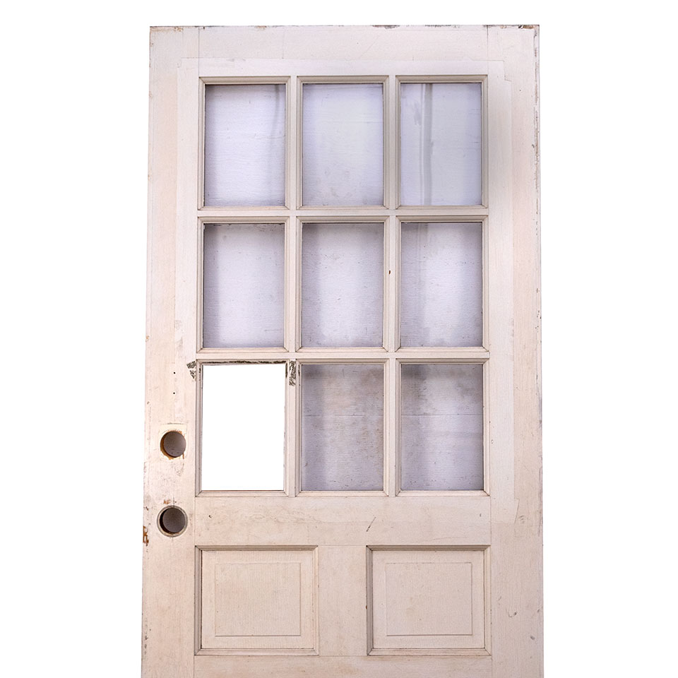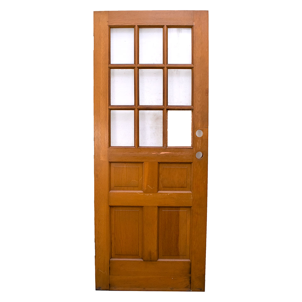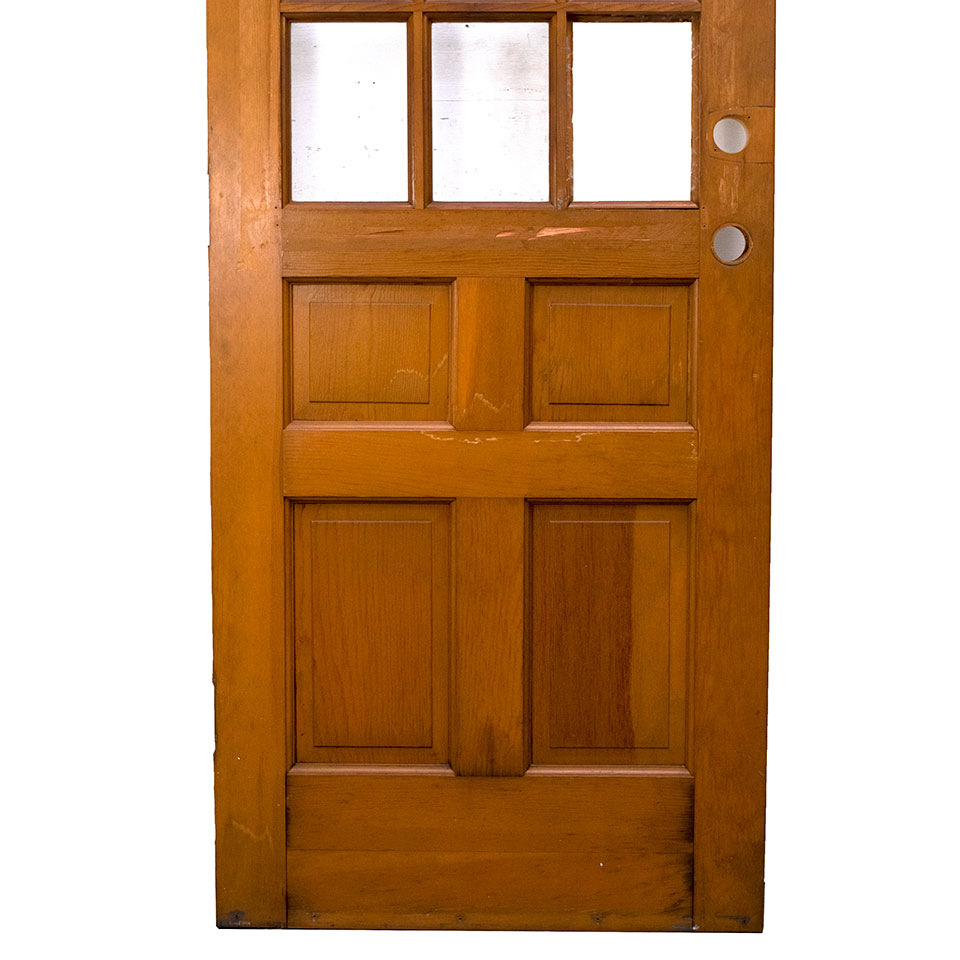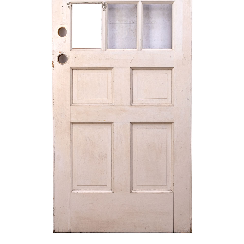 Vintage antique architectural salvage paneled wood entry door with divided half lite window measuring approximately 31 7/8" wide x 80" tall x 1 3/4" thick. The window is missing one glass pane (See photos).