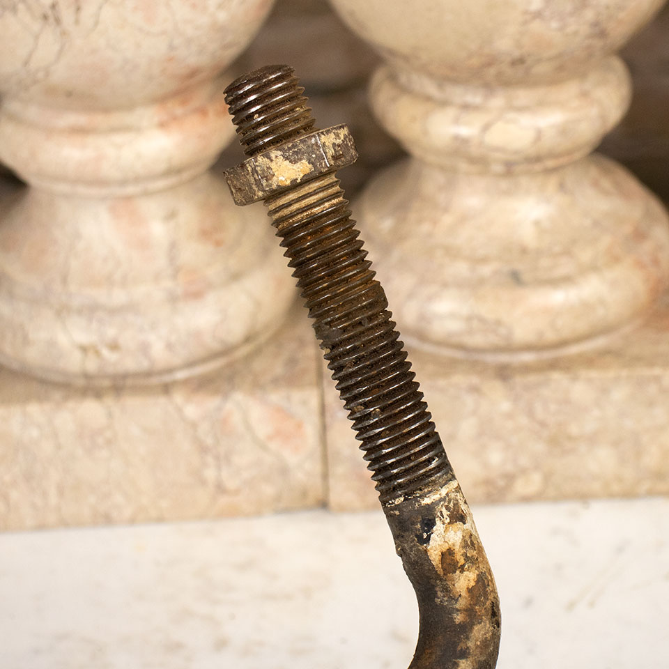 Antique architectural salvage industrial cast iron trolley wheels with swivel arm bolt. The 3" diameter wheels measure approximately 5 7/8" on center with a swiveling 3/4" diameter 90 degree threaded bolt arm. Priced at $20/each. Due to the nature of salvaged hardware - condition and patina may vary.