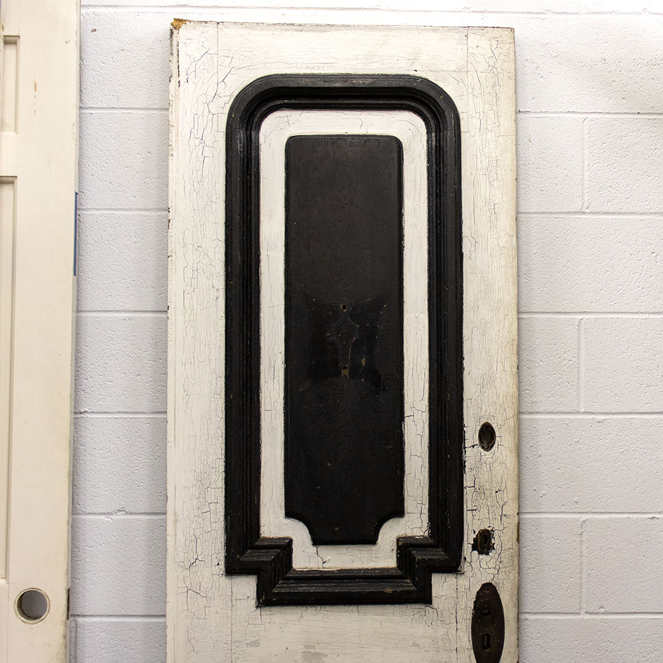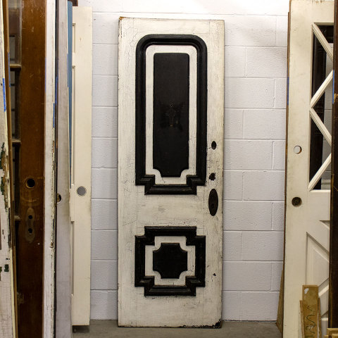 Vintage antique architectural salvage paneled wood entry door with raised trim details measuring approximately 26 3/4" wide x 79 1/4" tall x 1 3/4" thick.