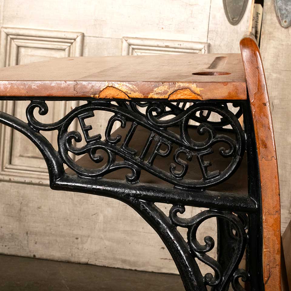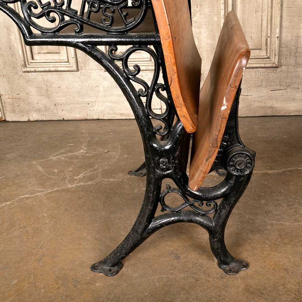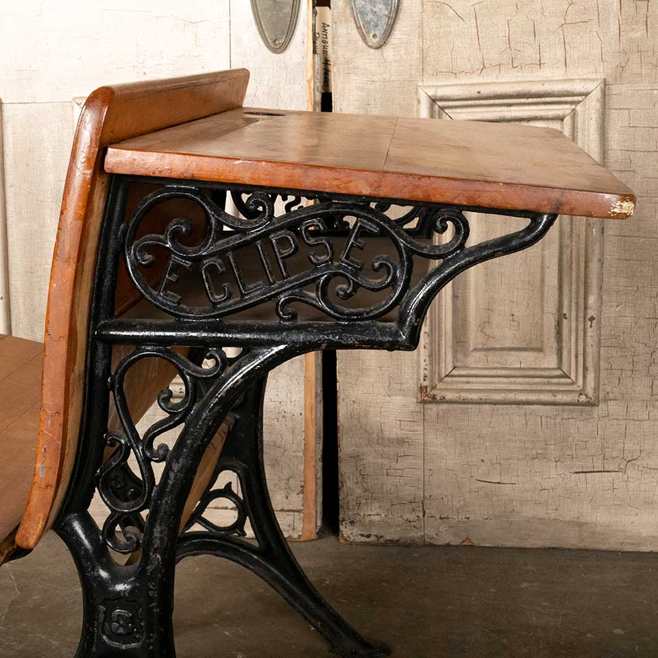 Architectural salvage antique ECLIPSE 3 wood and cast iron one room schoolhouse student school desk with fold up seat measuring approx. 22" wide x 27 3/4" tall x 28" front to back (when seat is down). See photos to evaluate condition.