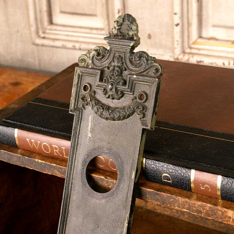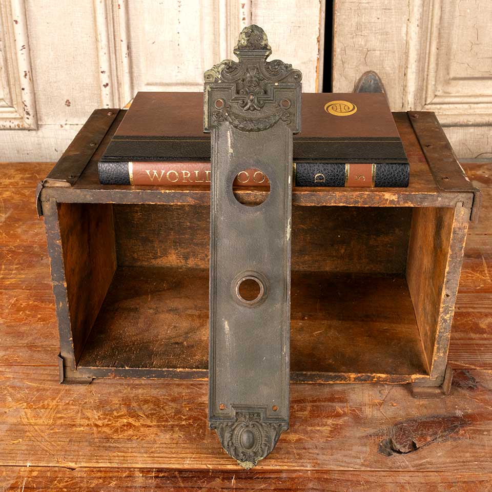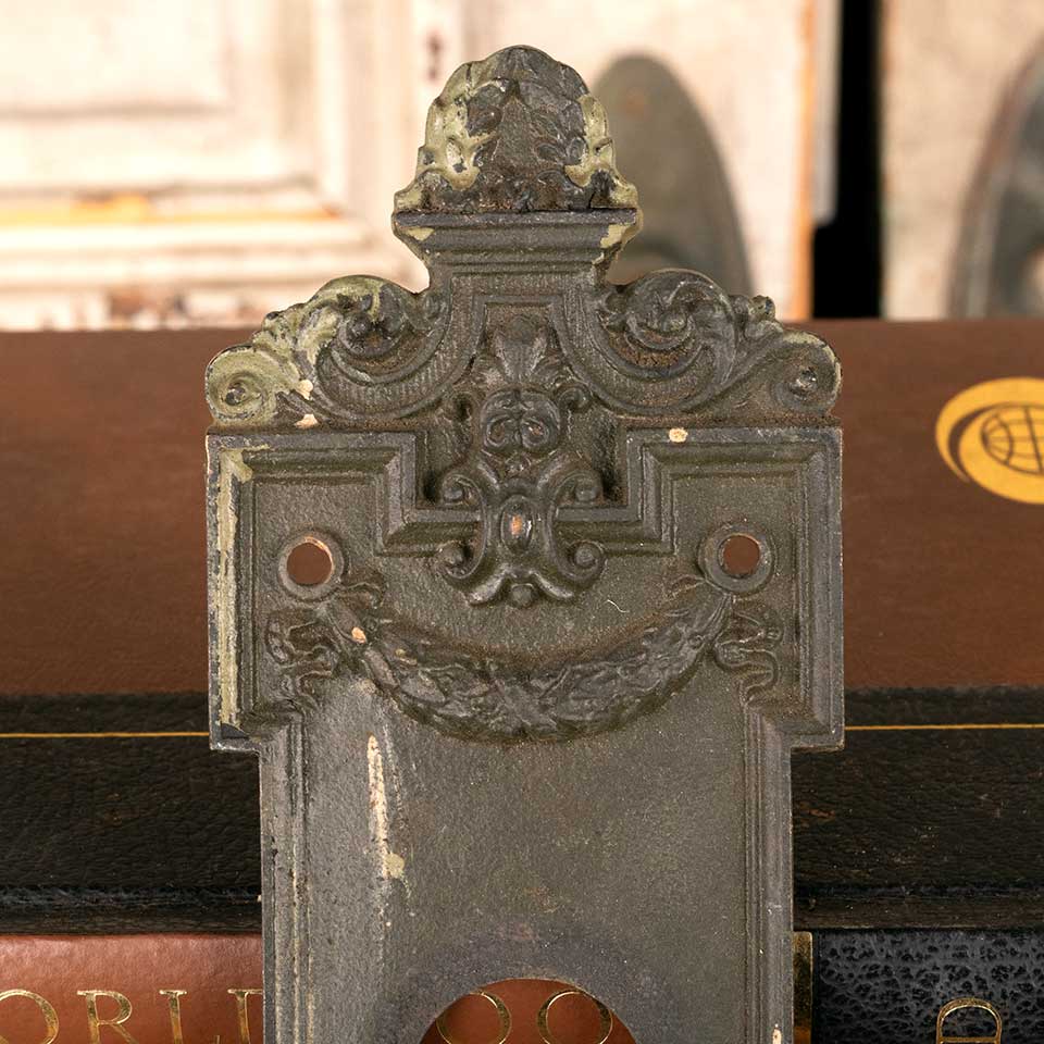 Architectural salvage antique cast iron Dartmoor entry doorknob backplate door hardware with deadbolt hole measuring approx. 3 1/8" wide x 14 3/8" tall x 1/4" thick with a 7/8" diameter collar. The collar and deadbolt hole measure 3 1/2" on centers. Color and condition vary, see photos to evaluate. Priced at $150/each.