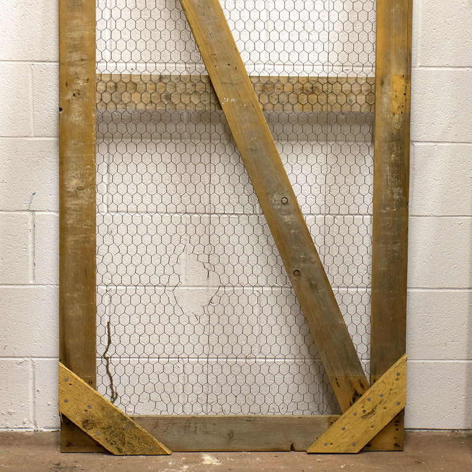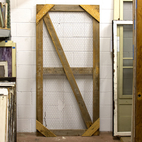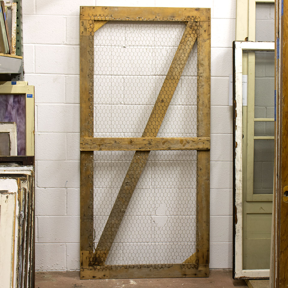 Vintage antique primitive reclaimed wood screen panel with metal chicken wire measuring approximately 36" wide x 74 5/8" tall x 1 1/2" thick.
