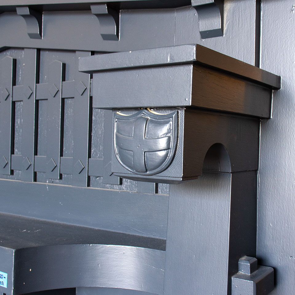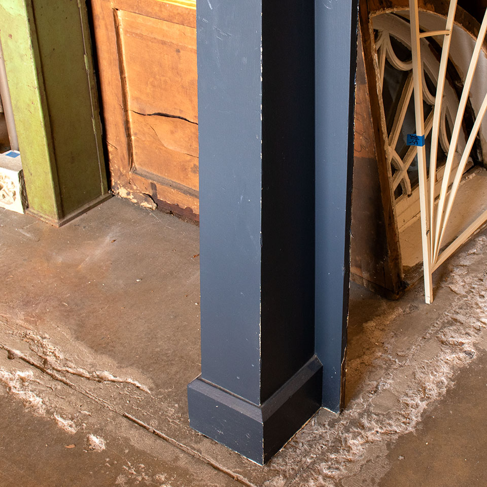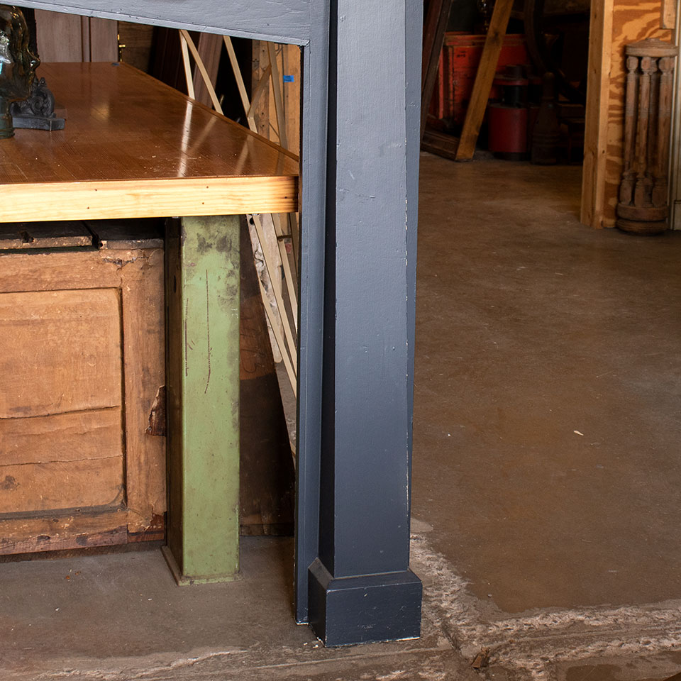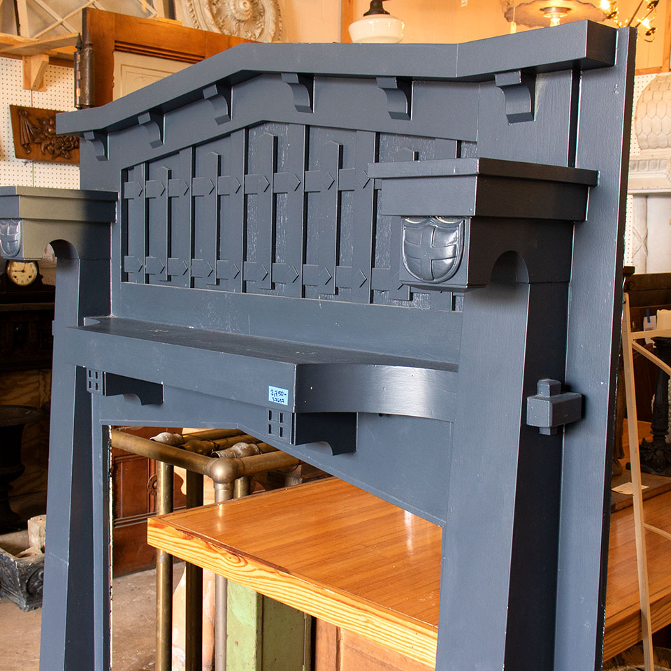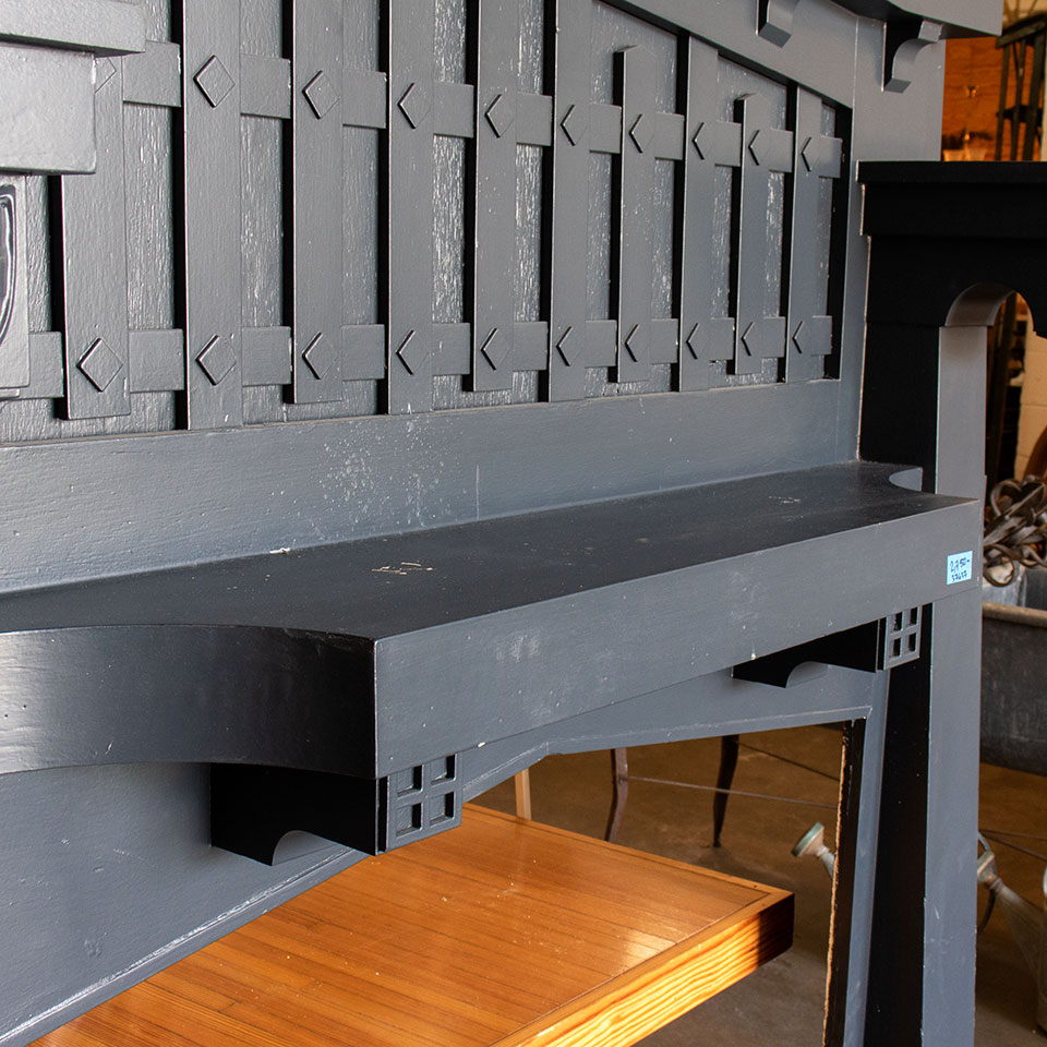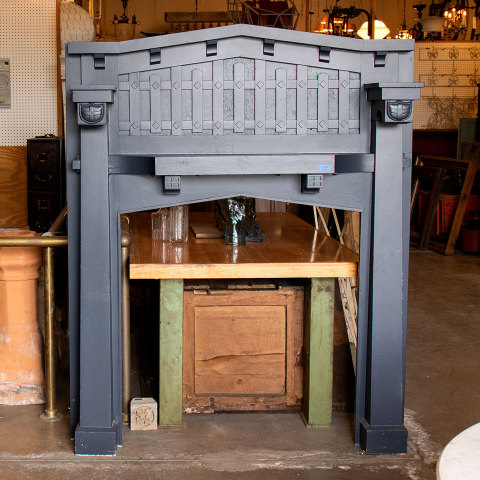 Vintage antique architectural salvage painted wood Arts & Crafts fireplace mantel measuring approximately 60" wide x 74" tall x 11 5/8" front to back. The firebox opening measures approximately 41 1/4" wide x 45" tall.
