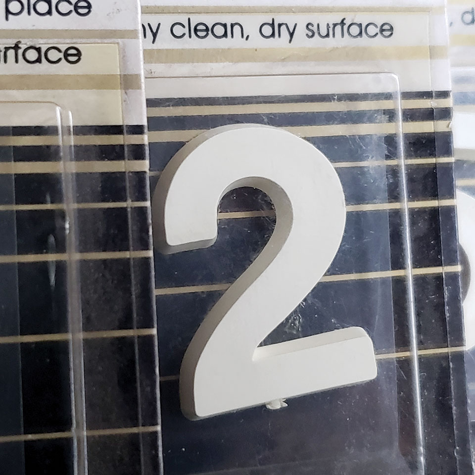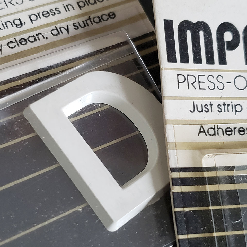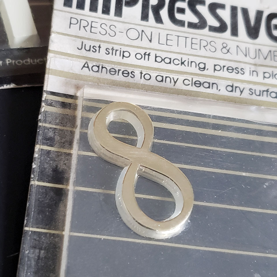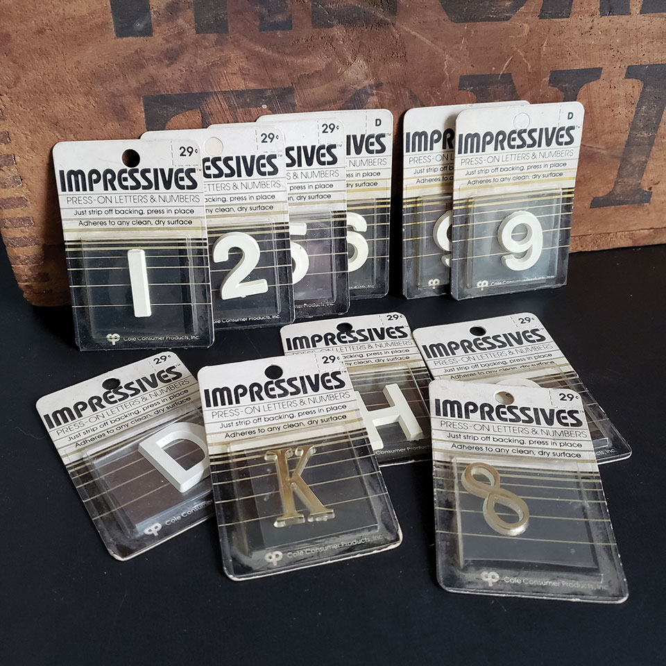 Set of 11 vintage new old stock Impressives press-on plastic numbers and letters by Cole each measuring approximately 3/4" wide x 1" tall. Set includes white letters and numbers: 2 5 6 9 9 D H I S and gold letters and numbers: 8 K. Sold as a set for $5.