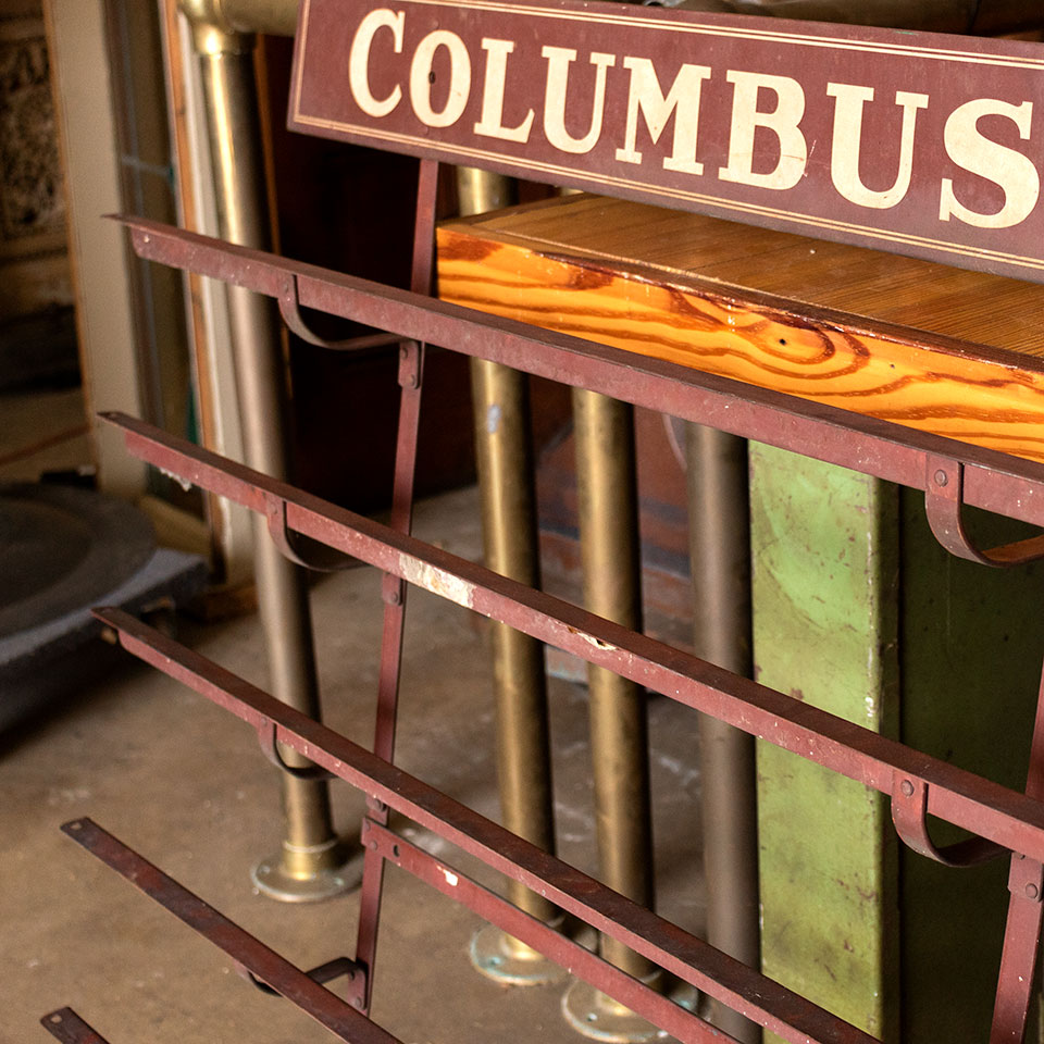 Vintage antique architectural salvage Columbus Oil Cloth metal wall mount retail advertising display rack for Columbus Coated Fabrics measuring approximately 57" wide x 38 1/4" tall x 4 3/4" front to back.