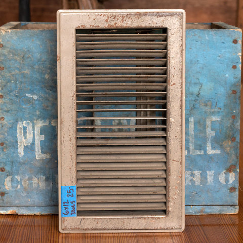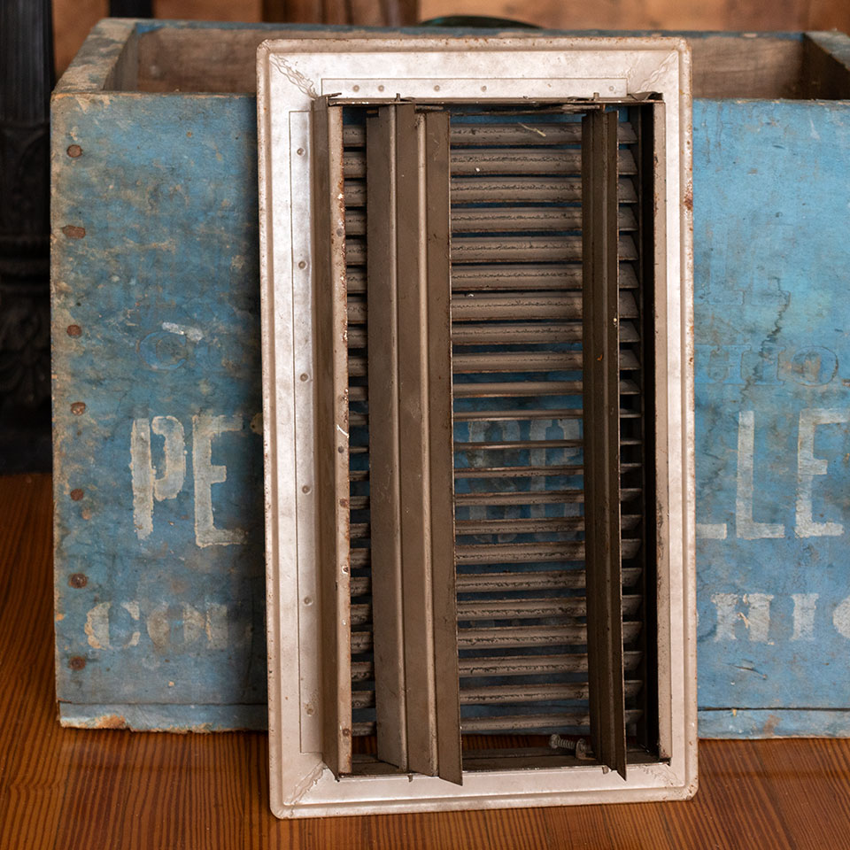 Salvaged metal floor heat grate with operable louvers measuring approximately 6" x 12" (insert dimensions) and 7 7/8" x 13 7/8" (overall dimensions).