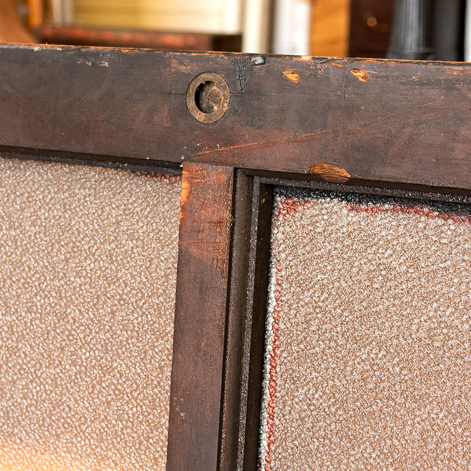 Large vintage antique architectural salvage divided lite wood window sash with pressed glass measuring approximately 76 1/4" wide x 42" tall x 2" thick.