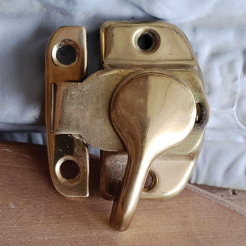 Salvaged brass window sash lock and keeper hardware set. The lock measures 2 3/8" wide x 1 3/8" front to back. The keeper measures 2 1/4" wide x 5/8" front to back. Priced at $10/set.
