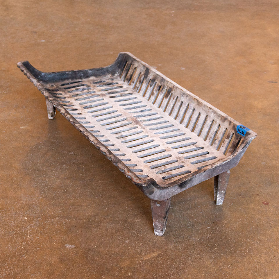 Vintage antique architectural salvage cast iron fireplace log holder measuring approximately 27 1/4" wide x 6 1/4" tall x 12 1/4" front to back. There is a crack in the middle of the log holder basket (please see photos to evaluate condition).