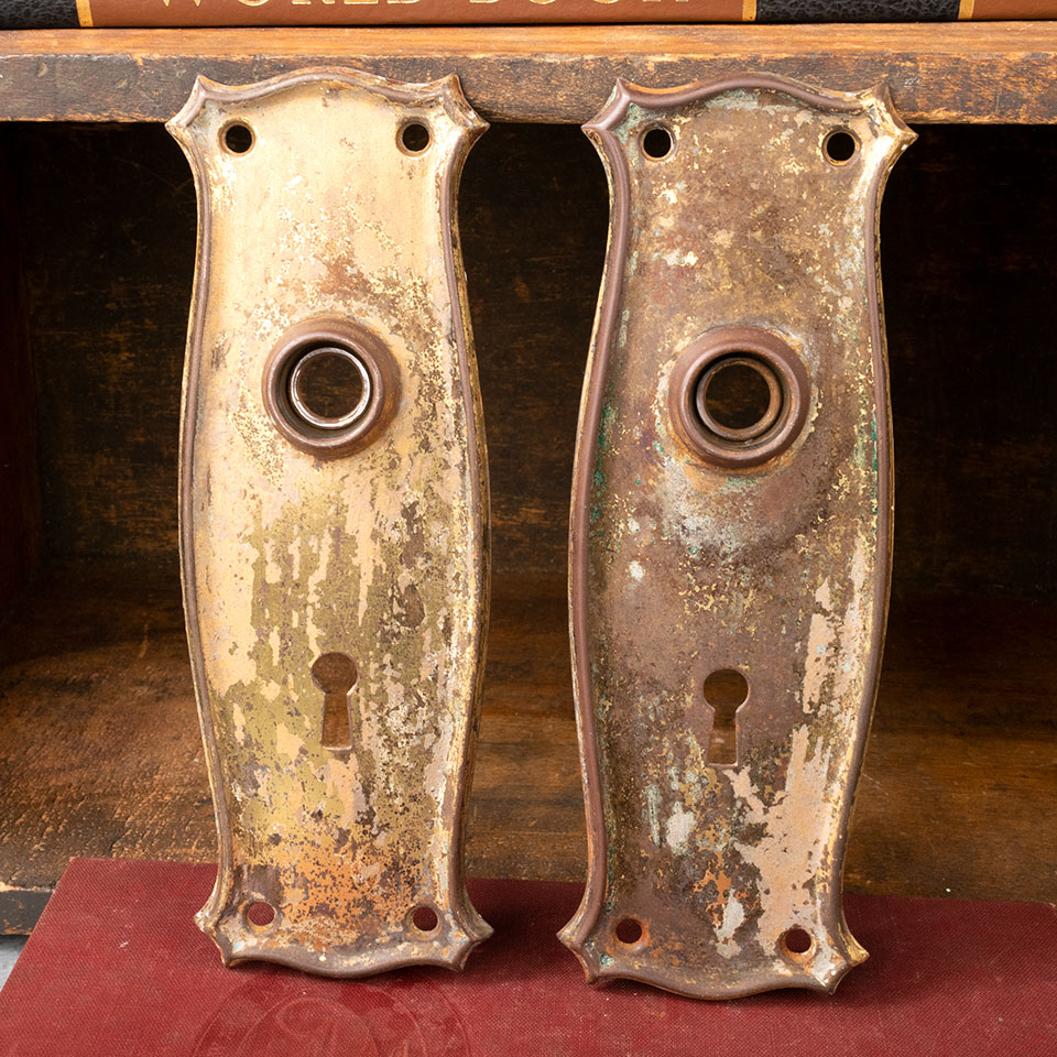 Pair of antique architectural salvage steel doorknob backplates each measuring approximately 2 3/8" wide x 7" tall with 11/16" diameter collars. Priced at $40 for the pair.