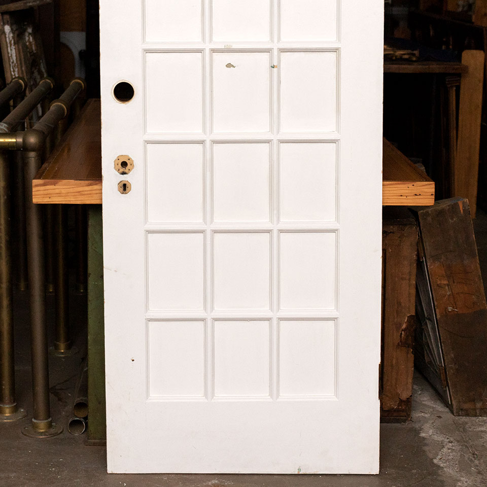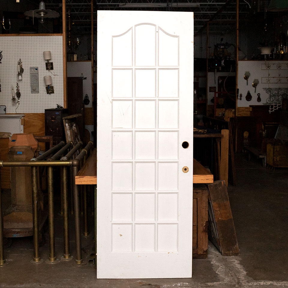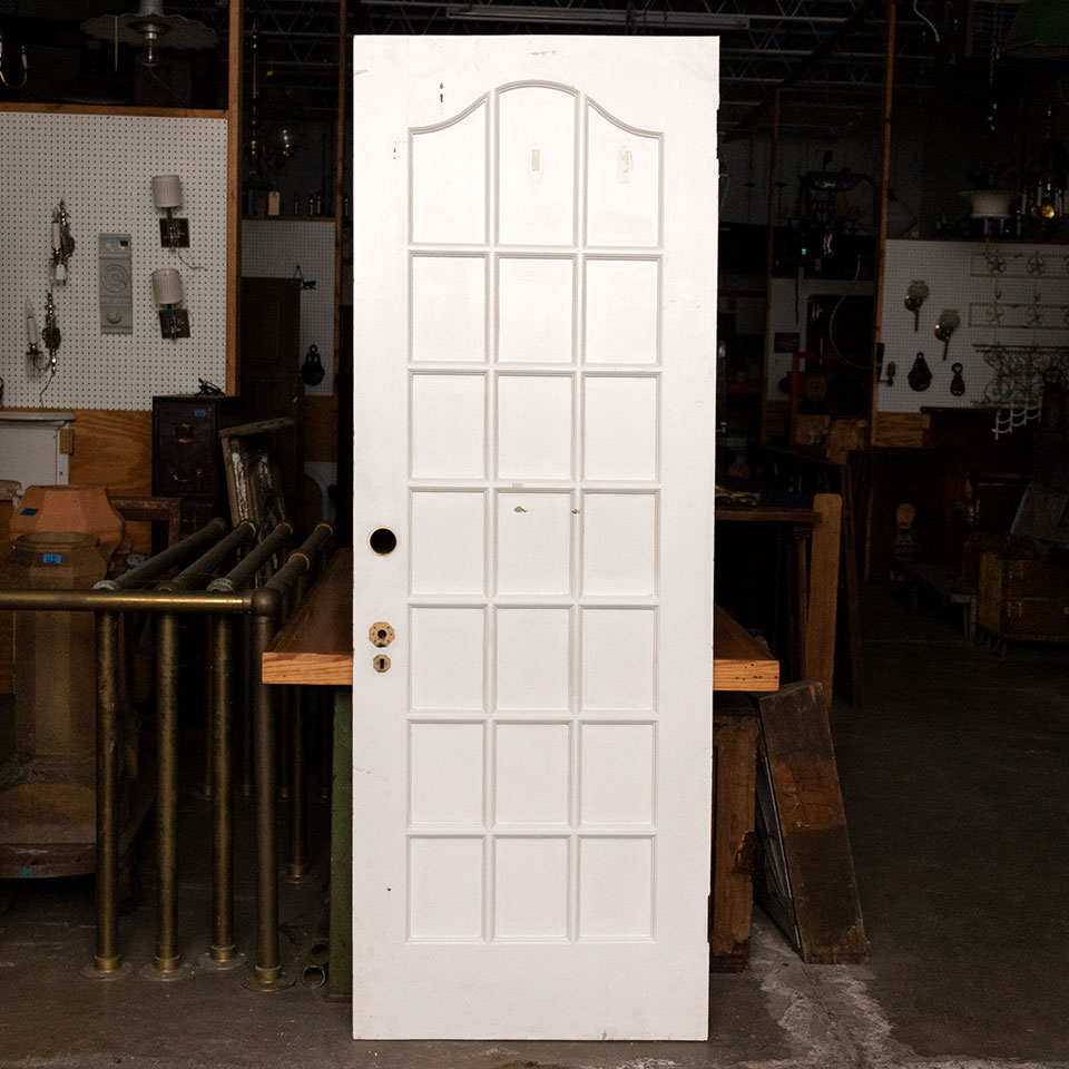 Vintage antique architectural salvage painted wood 21 lite French door measuring approximately 29 7/8" wide x 83 1/4" tall x 1 3/4" thick. The glass panes have been painted over. Please see photos to evaluate condition. #archedtop
