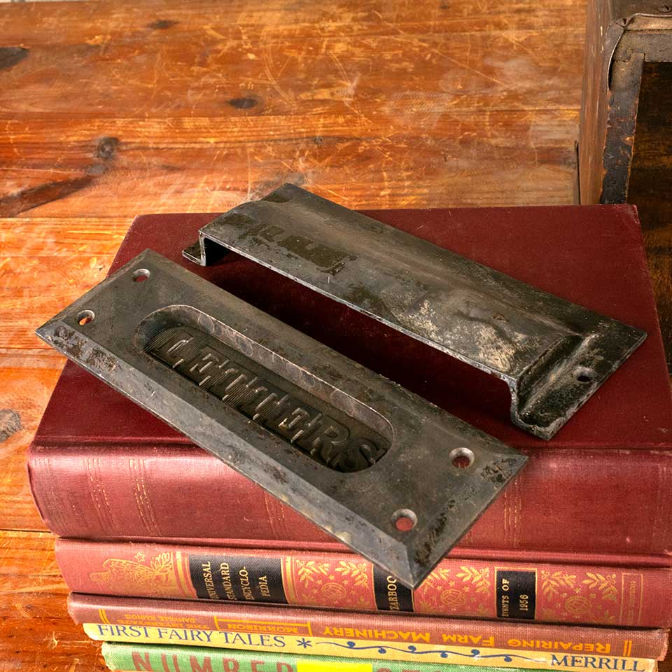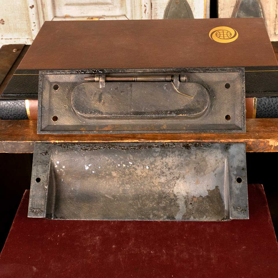 Architectural salvage cast iron entry door mail slot hardware with hinged LETTERS flap measuring approx. 7" wide x 2 1/4" tall x 1/4" front to back. The mail slot measures approx. 4 3/8" wide x 1 1/8" tall. The interior mail slot hood measures approx. 7" wide 2 1/2" tall x 3/4" front to back with a 5 7/8" wide opening. Color and condition vary, see photos to evaluate. Priced at $150/set.