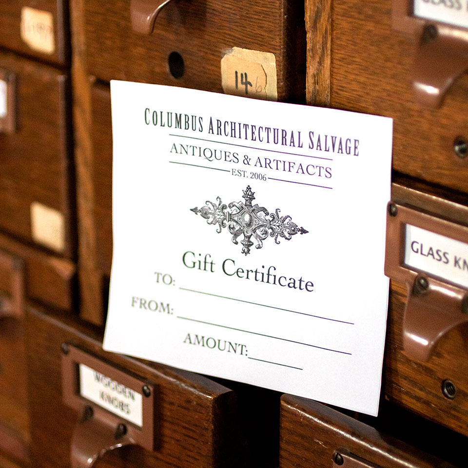 A Columbus Architectural Salvage GIFT CERTIFICATE makes a great gift for family and friends. Do you know someone who bought an older home, an antique or architecture lover, or someone who enjoys treasure hunting? This gift supports architectural salvage and helps divert reusable building materials from landfills, making them available for reuse in homes and businesses.