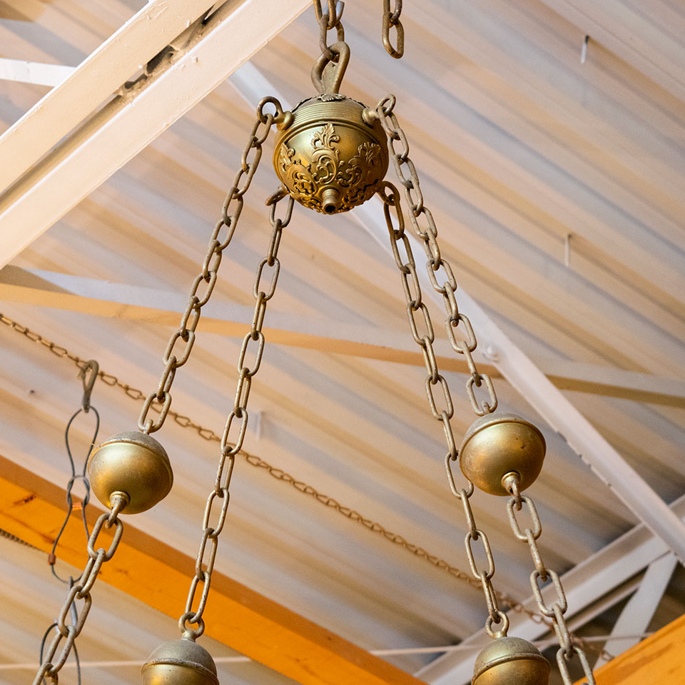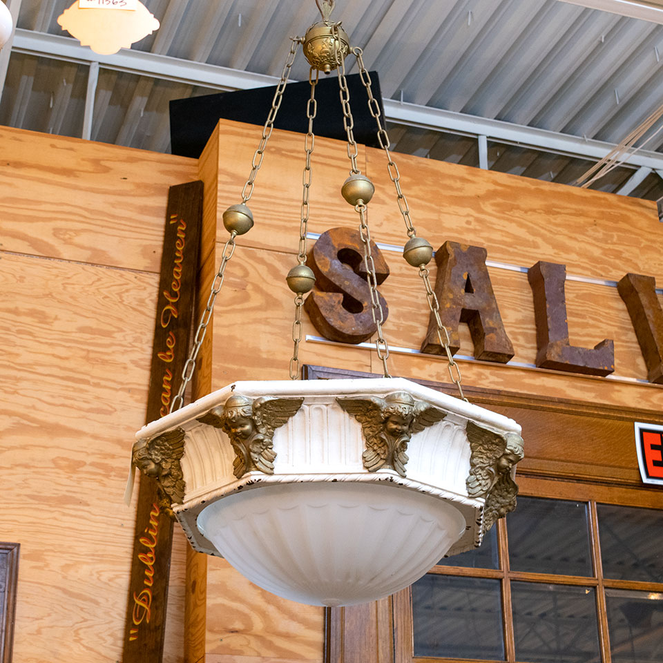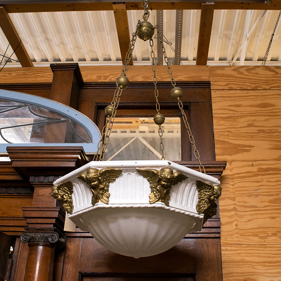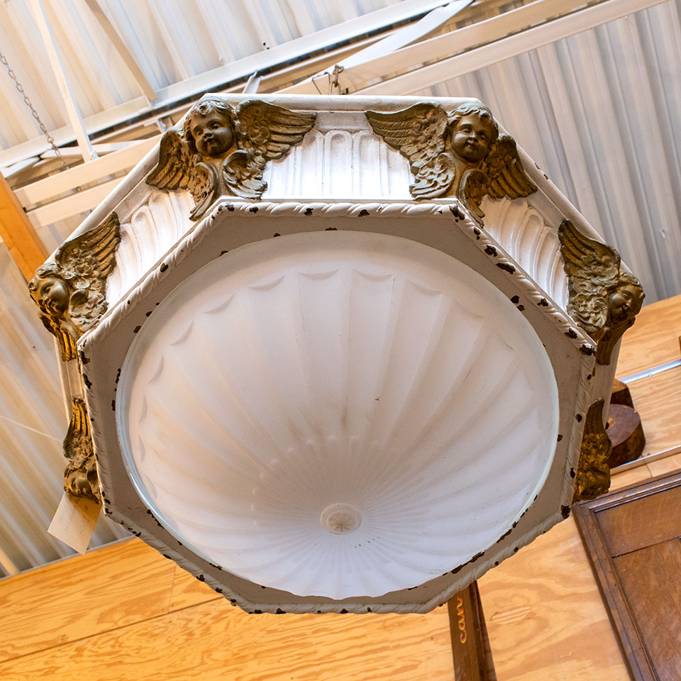 Vintage antique architectural salvage octagonal plaster chandelier with cherubs measuring approximately 32 1/2" in diameter x 5' tall (does not include top hanging chain). This fixture will need to be wired with a new light source. Due to the nature of architectural salvage, color and condition may vary. One fixture is missing its glass shade.