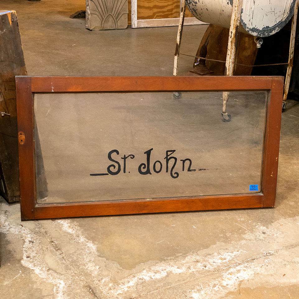 Vintage antique architectural salvage wood transom window measuring approximately 38" long x 20" tall x 1 3/4" thick. "St. John" is painted on the glass.