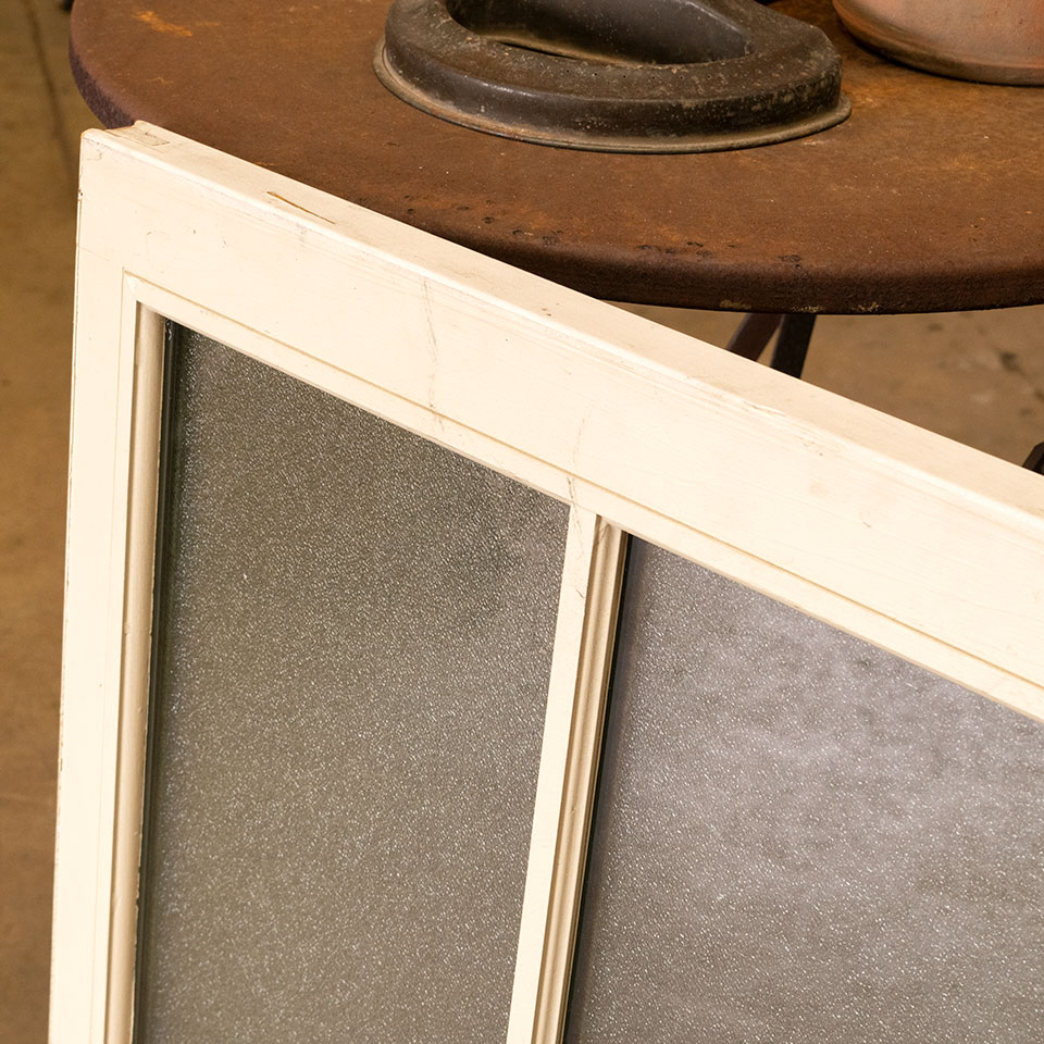 Salvaged contemporary simulated divided lite wood window sash with privacy glass measuring approximately 30 1/2" wide x 29 1/8" tall x 1 1/4" thick.