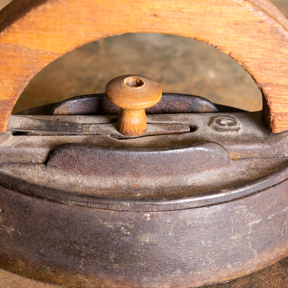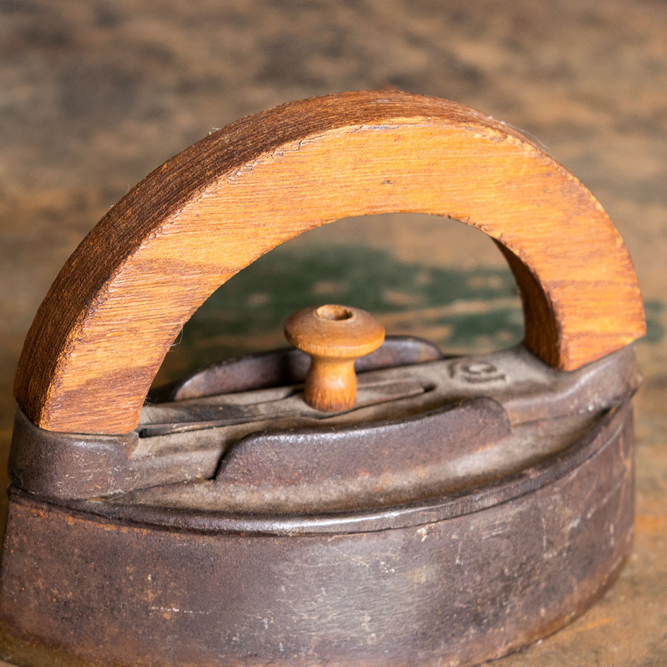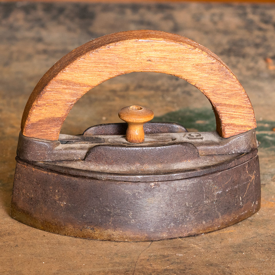 Vintage antique cast iron sad iron with wood handle measuring approximately 3 3/8" wide x 4 3/4" tall x 6 1/2" front to back.