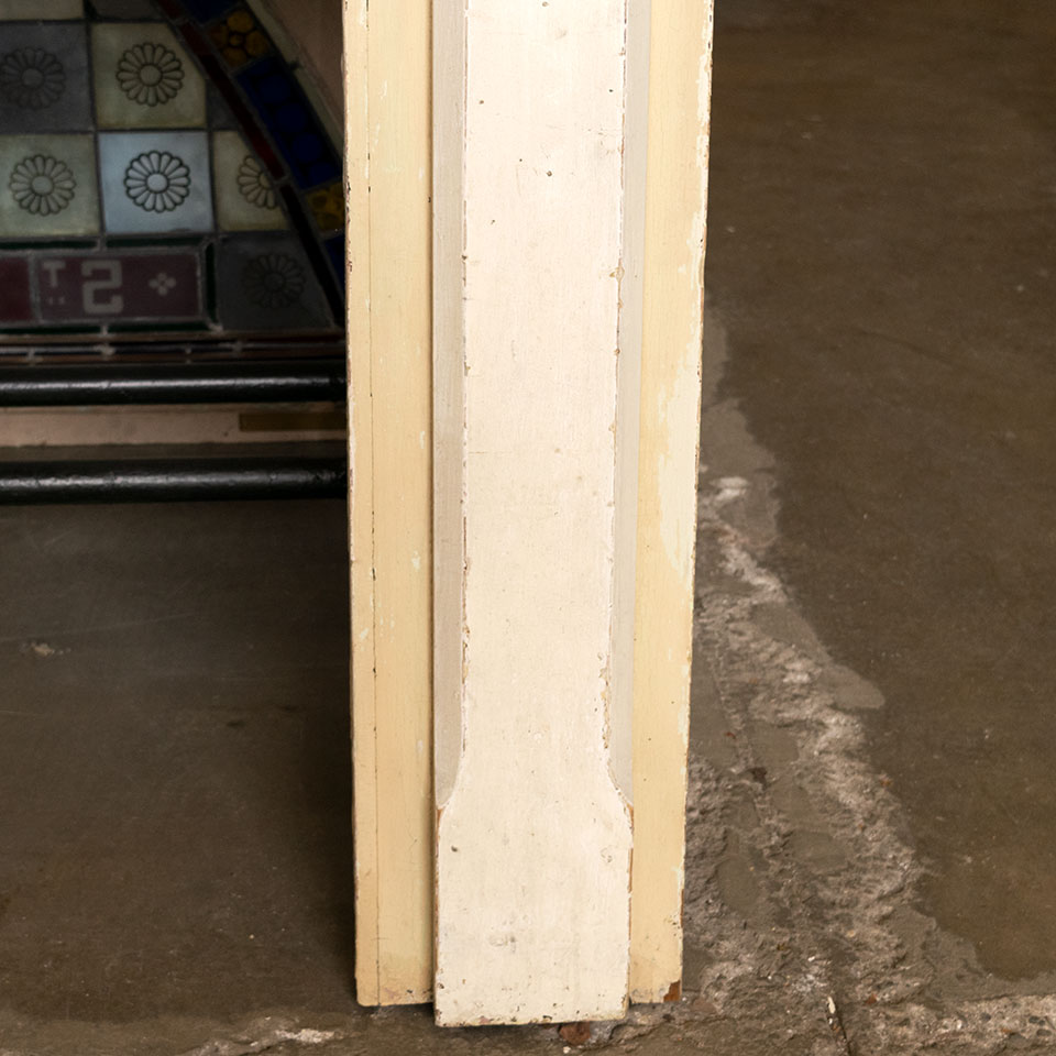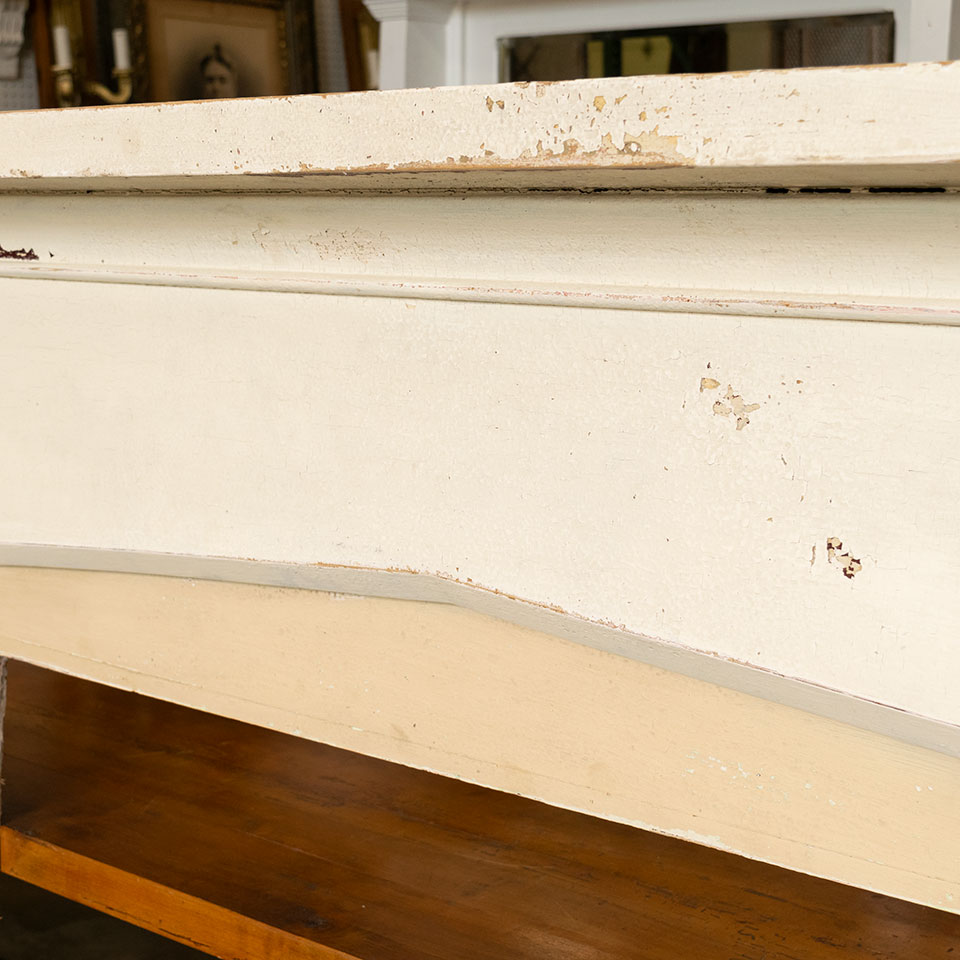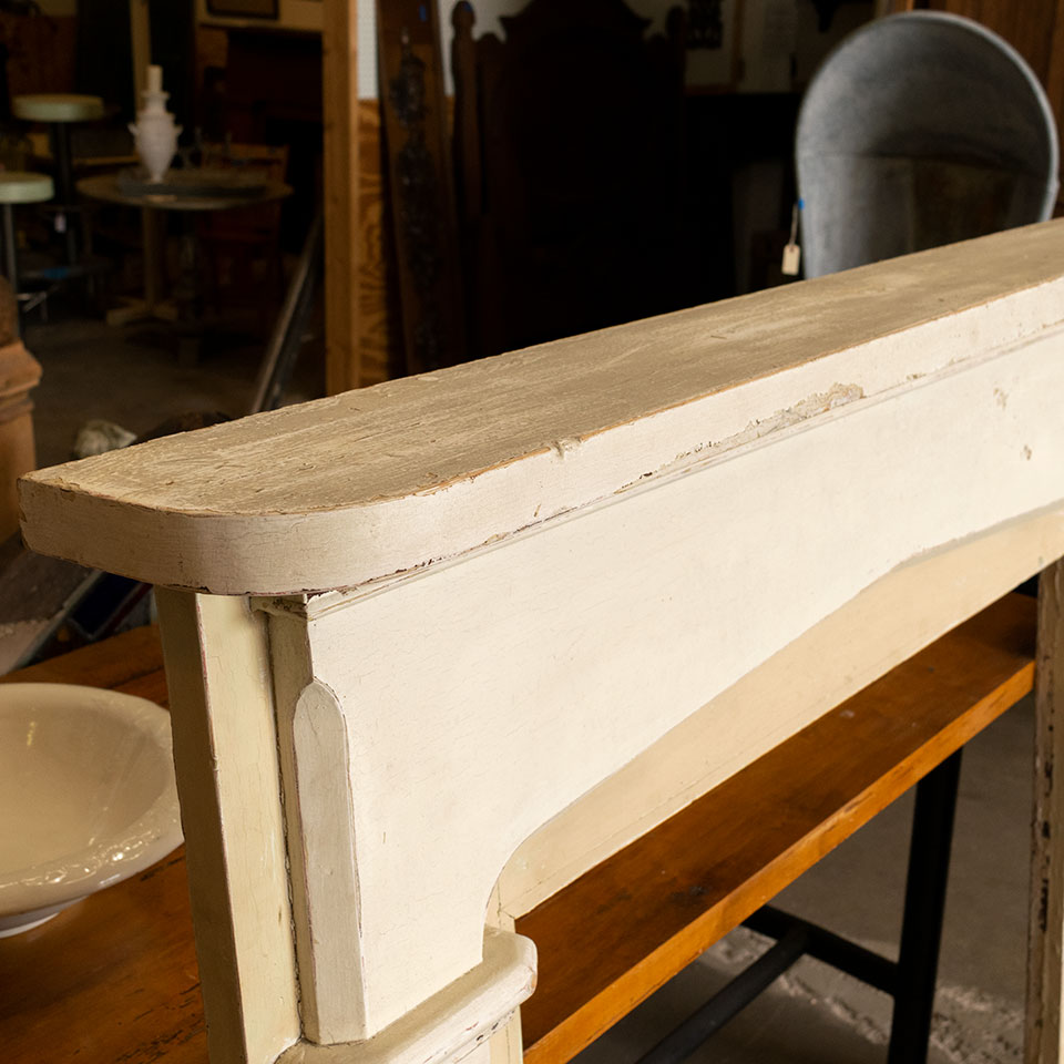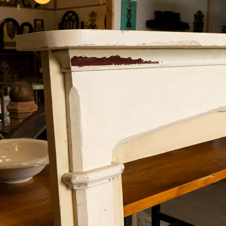 Vintage antique architectural salvage painted wood fireplace mantel measuring approximately 71" wide x 57 1/2" tall x 8" front to back. The interior firebox opening measures approximately 44 1/4" wide x 41" tall.